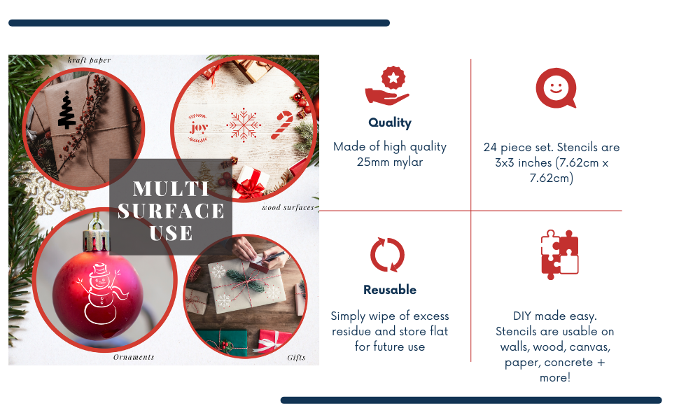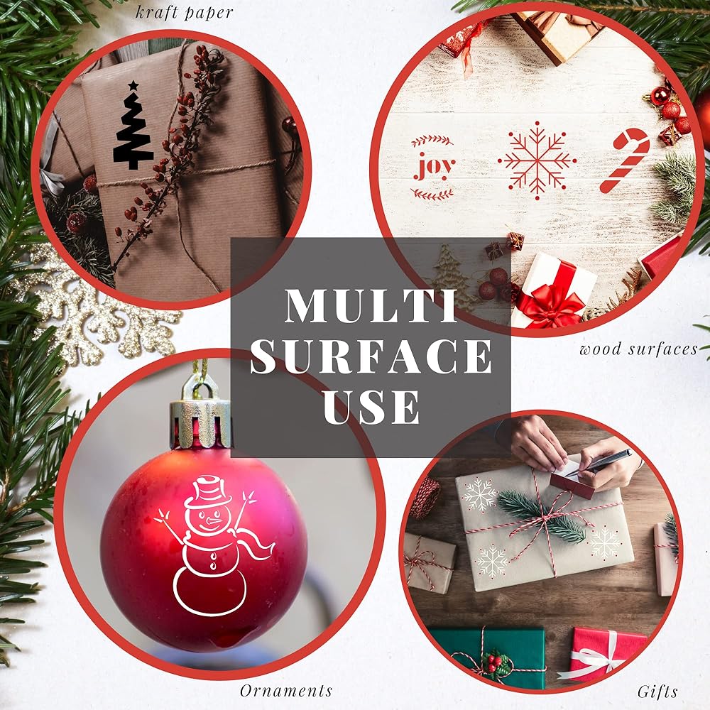 • 🎄 استنسل للحرف اليدوية لطلاء الحلي + المزيد! هذه الاستنسلات الصغيرة للحرف اليدوية قابلة للاستخدام وإعادة الاستخدام في مجموعة متنوعة من المشاريع. انتظر حتى يجف الطلاء بعد الاستخدام، قم بتنظيفه وتخزينه جافًا ومسطحًا للاستخدام في المستقبل.