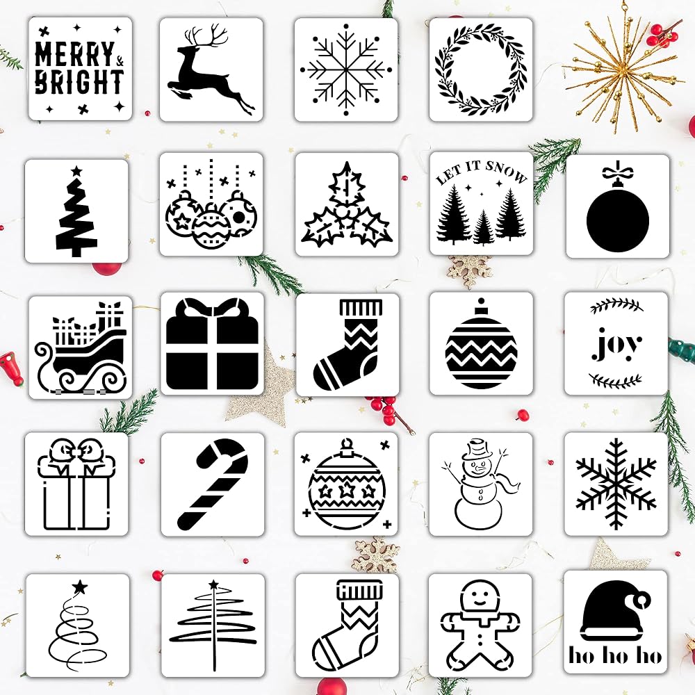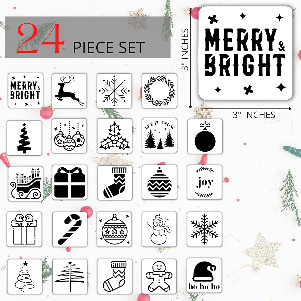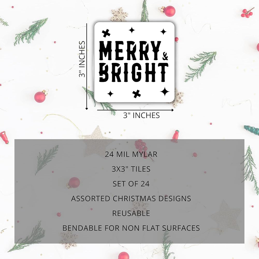 • 🎄 استنسل للعطلات - تتضمن عبوة من 24 استنسل مربع مقاس 3 × 3 انش.