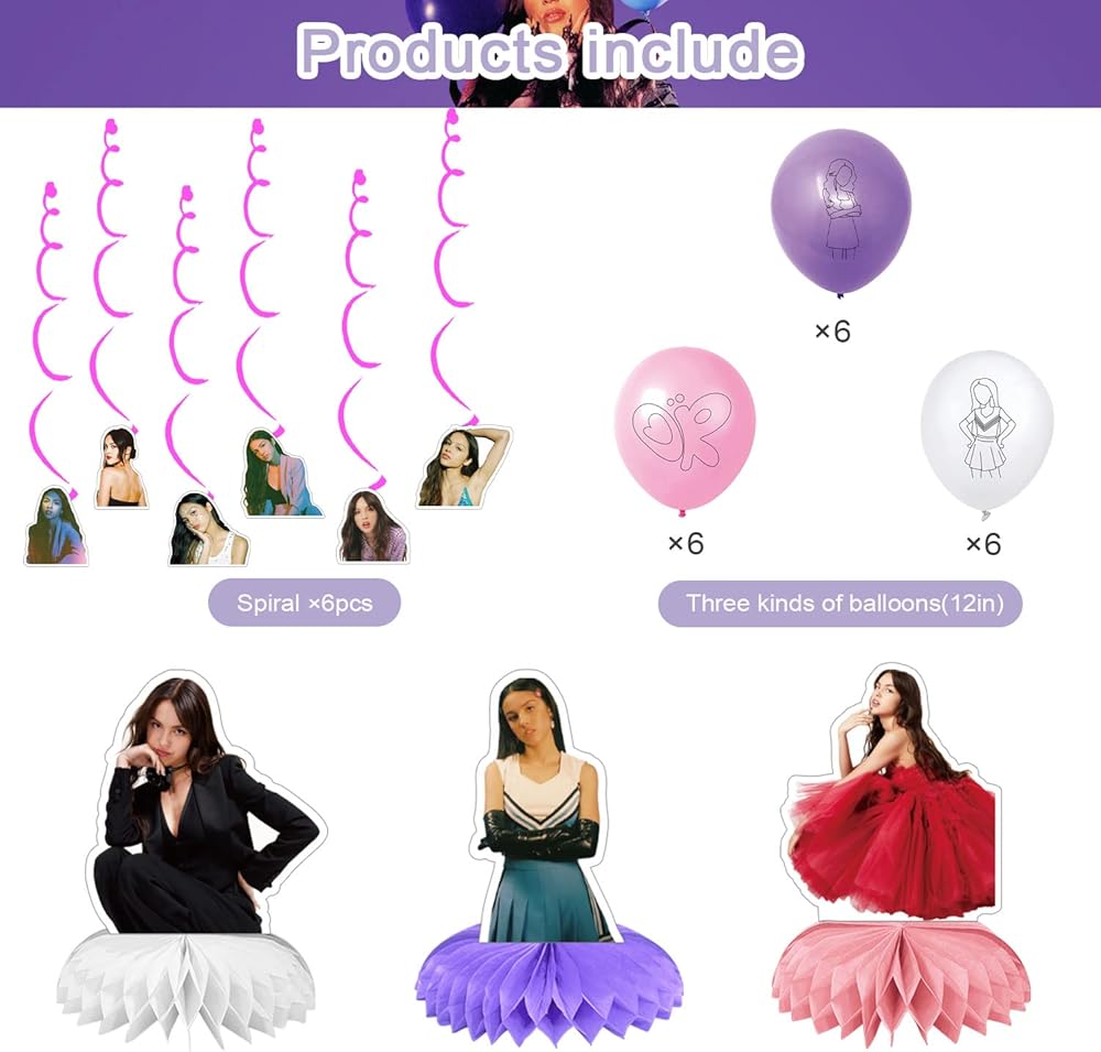 مواد زينة حفلات اوليفيا: لافتة حفلات اوليفيا وقطعة علوية للكب كيك وقطع مركزية على شكل قرص العسل وبطاقات عيد ميلاد اوليفيا مصنوعة من ورق عالي الجودة، ودوامات عيد الميلاد المعلقة مصنوعة من مادة بلاستيك PVC؛ جنبًا إلى جنب مع بالونات اللاتكس، فإن مجموعة تزيين الحفلات بطابع اوليفيا آمنة ومتينة للاستخدامات المتعددة.