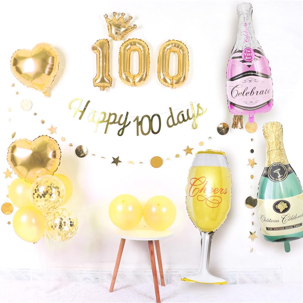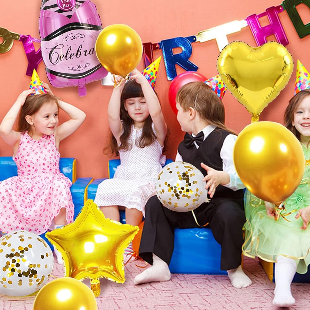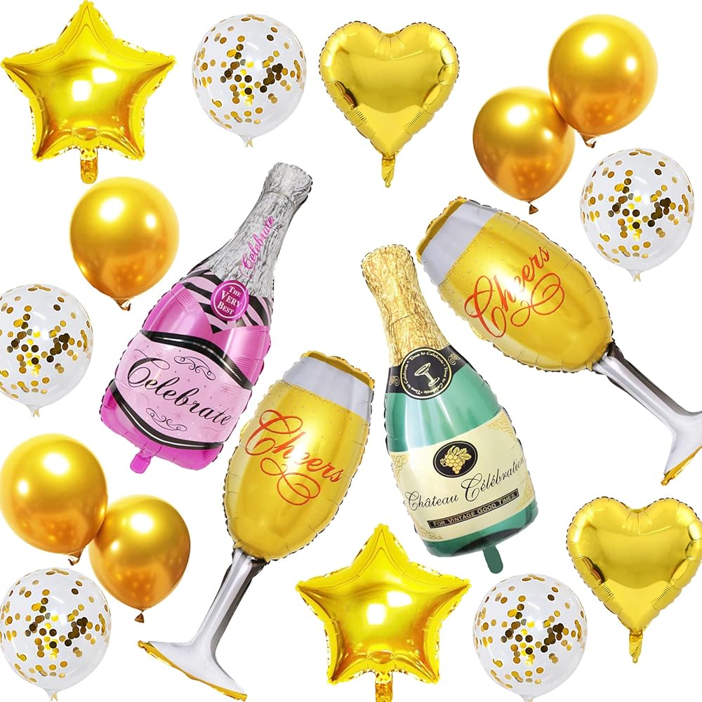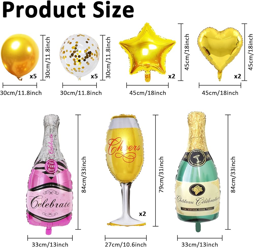 【Package Includes】You will receive 8PC aluminum film balloons and 10PC latex balloons. Including 1PC green champagne bottle, 1PC pink champagne bottle, 2PC wine glasses, 2PC heart balloons, 2PC pentagram balloons, 5PC gold glitter silicone balloons, 5PC gold silicone balloons.