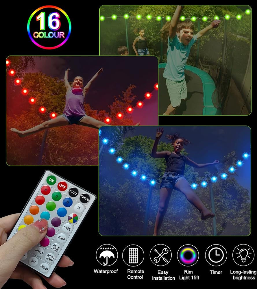• 【التحكم عن بعد】- تأتي أضواء الترامبولين مع جهاز تحكم عن بعد، ومسافة تحكم تصل إلى 16 قدمًا، والتي يمكنها اختيار 16 لونًا مختلفًا، و7 أوضاع وامضة، و4 إعدادات مؤقت، مما يوفر لك المزيد من الخيارات.