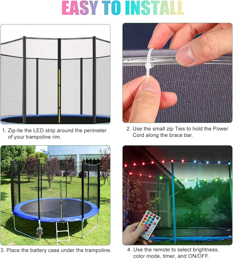 • 【تركيب سهل】- مصابيح LED للترامبولين سهلة التركيب. تعمل بالبطارية، ونحن نقدم السحابات، لذلك تحتاج فقط إلى تثبيتها على الترامبولين دون تركيب أسلاك معقدة.