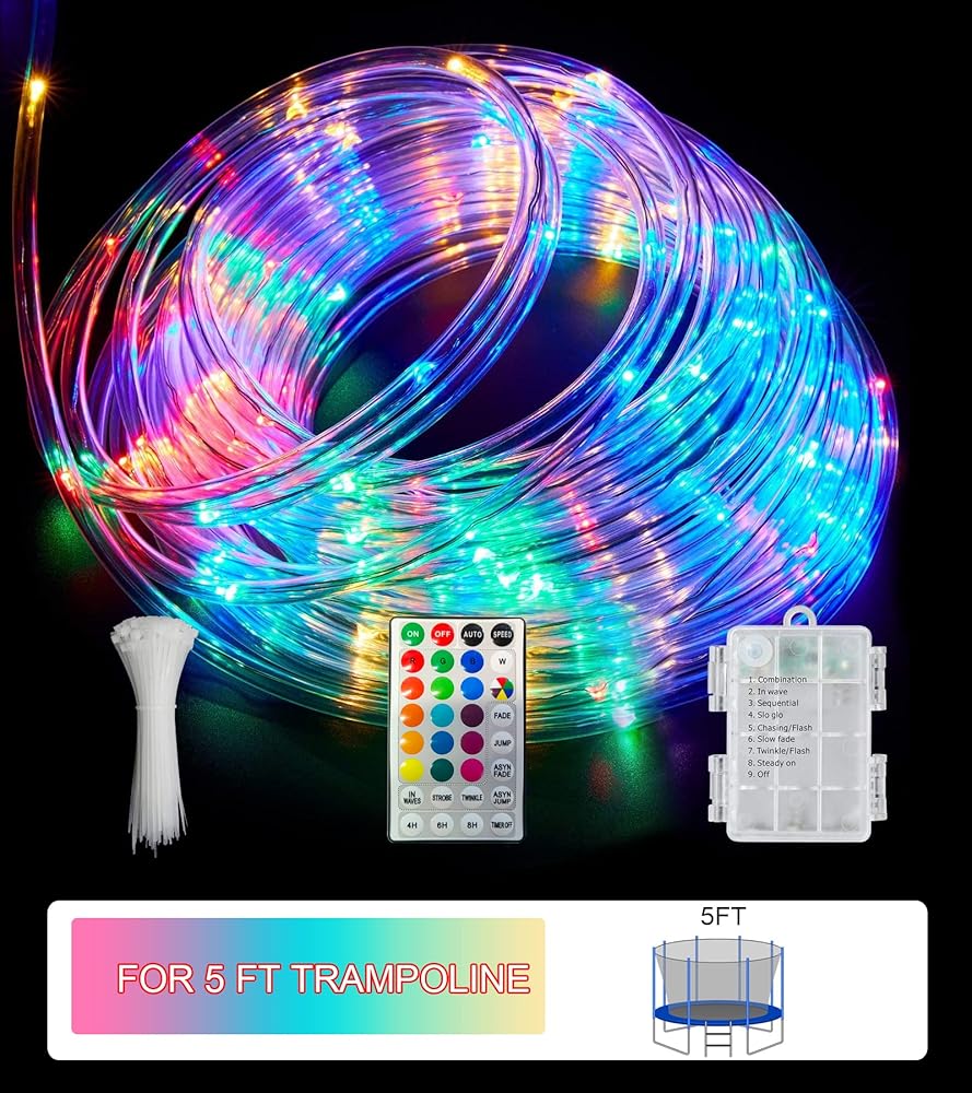 • 【أفضل هدية للأطفال】- سوف تحصل على 1 × أضواء ترامبولين بطول 15 قدمًا، و1 × 32 مفتاح تحكم عن بعد، و1 × صندوق بطارية (باستثناء بطاريات AA)، و30 سحابًا كبيرًا. مناسبة للترامبولين بطول 5 أقدام، إذا كان لديك ترامبولين أكبر، فيرجى طلب مجموعتين.
