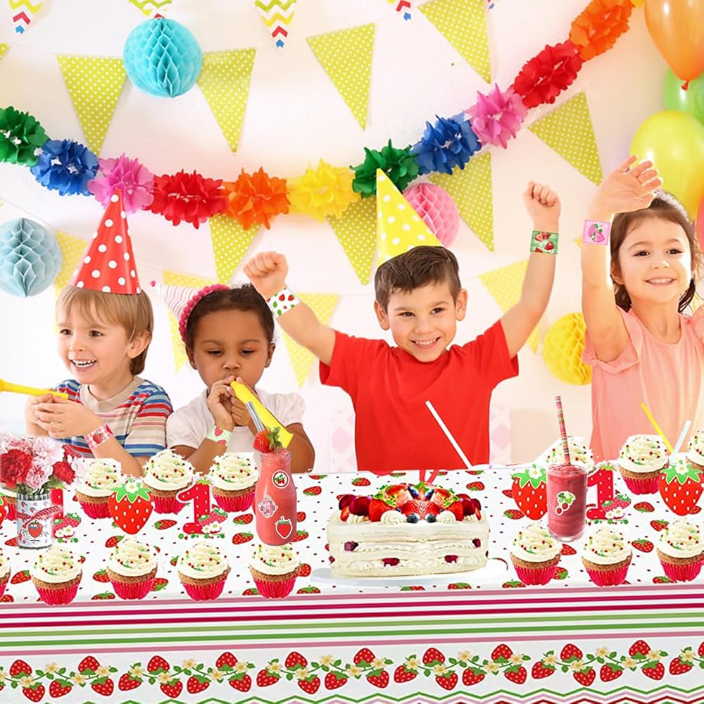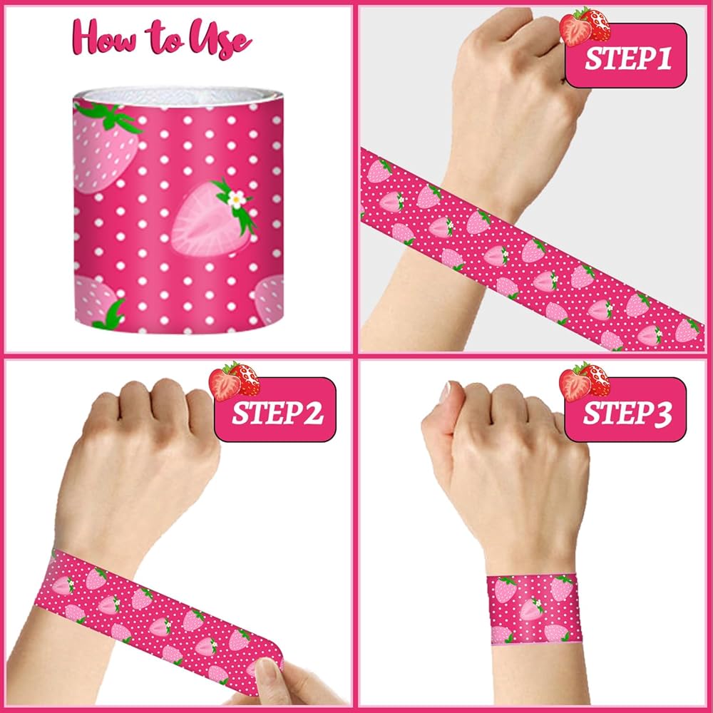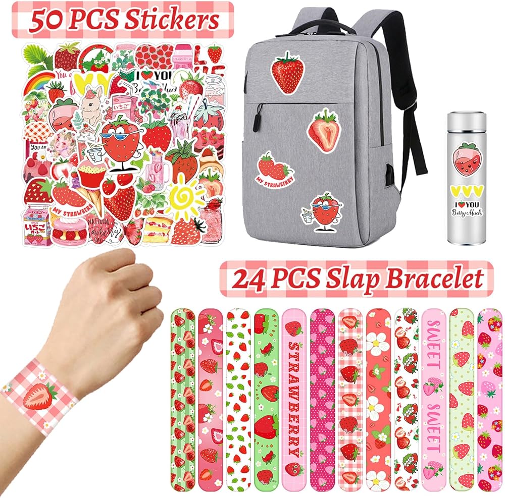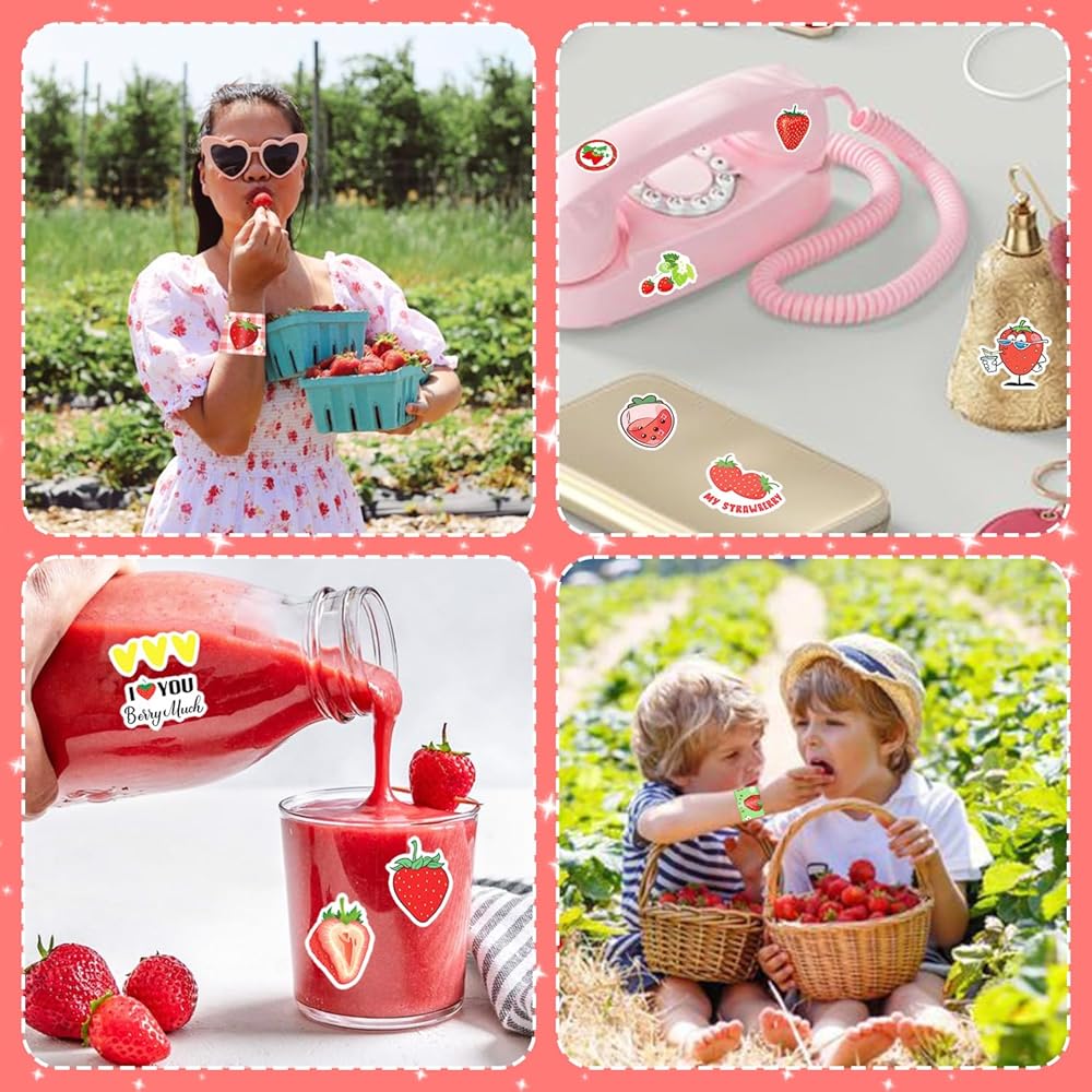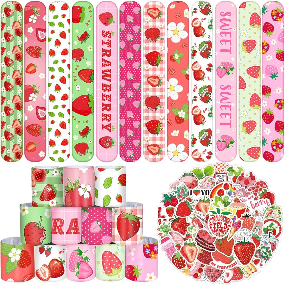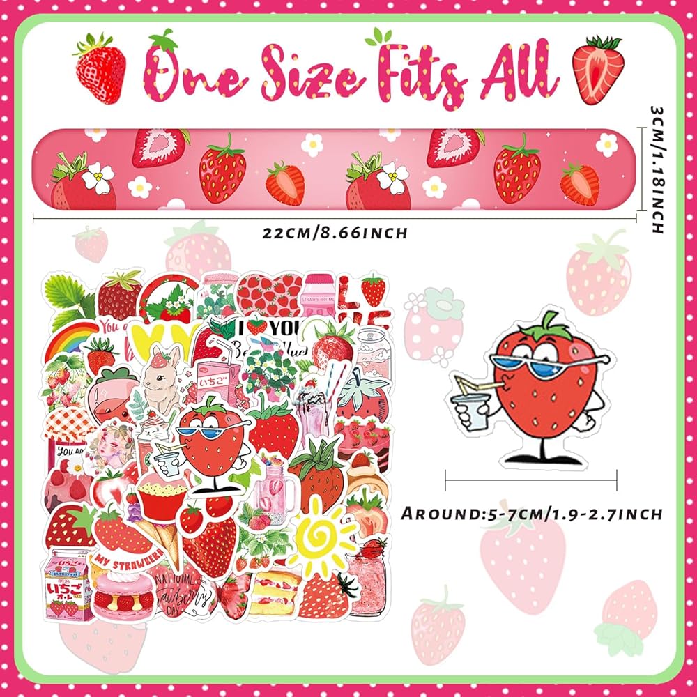50 ستيكر لاصق و24 قطعة من الأساور، تتميز بتصميم فريد من نوعه مع الفراولة والفراولة الحلوة والفراولة اللطيفة، والفراولة المختلفة، وغيرها من الأنماط الجميلة ستجعل حفلتك لا تنسى!