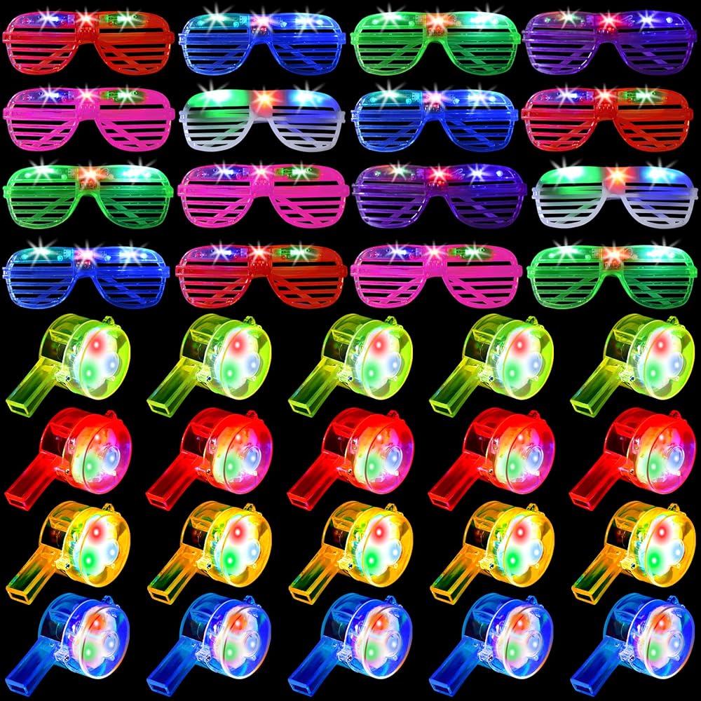 36 قطعة من لوازم الحفلات LED تتضمن 20 صافرة مضيئة مع قلادة حبل و16 قطعة من النظارات المضيئة LED تتوهج في الظلام، هدايا حفلات النيون والكرنفال والكريسماس والهالوين
