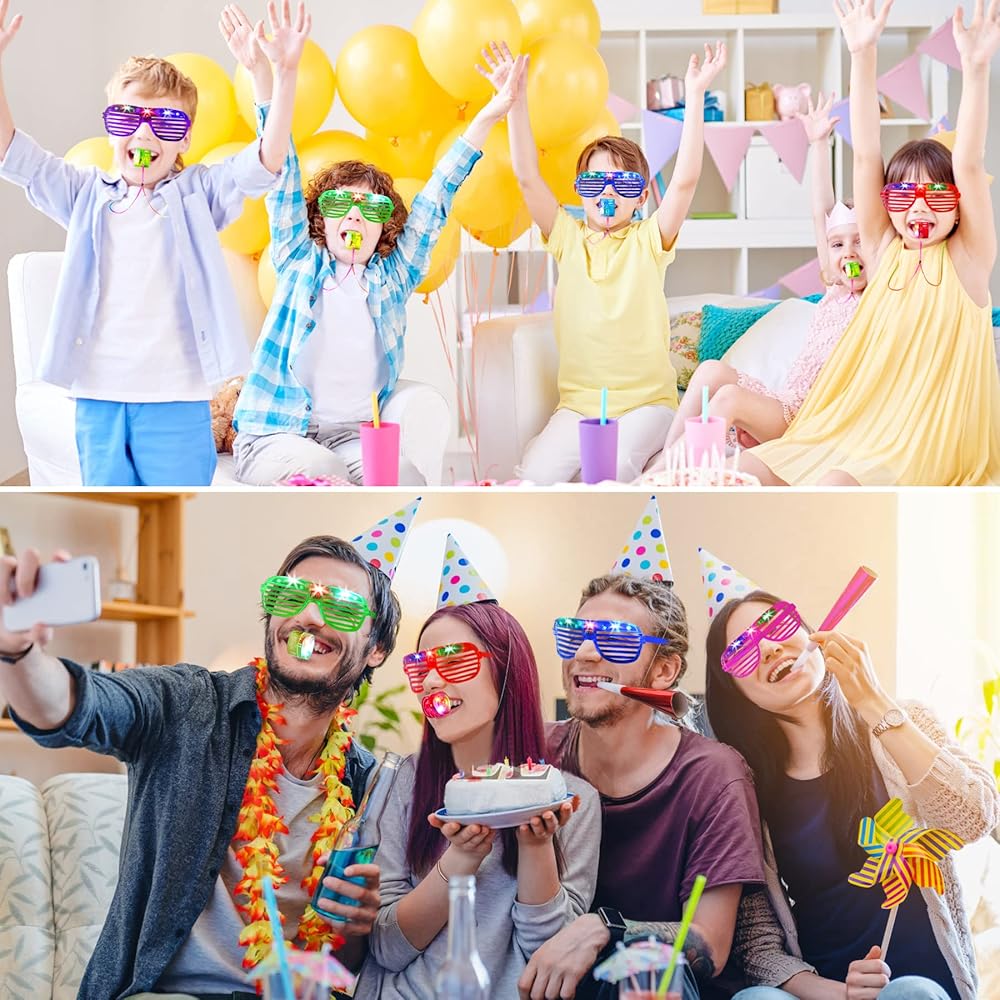 【استخدام واسع النطاق】تعد نظارات LED والصفارات ديكورات رائعة للحفلات ذات الطابع المتوهج والحانات والنوادي والكرنيفا وحفلات الديسكو والهالوين والكريسماس وأعياد الميلاد والحفلات الموسيقية الخارجية، وتساعد على إضاءة جو الحفلات بشكل أفضل.