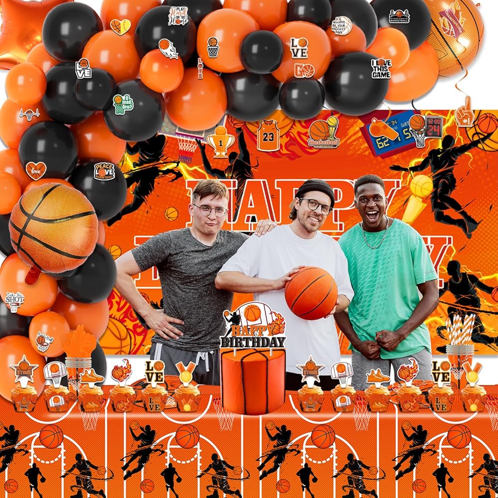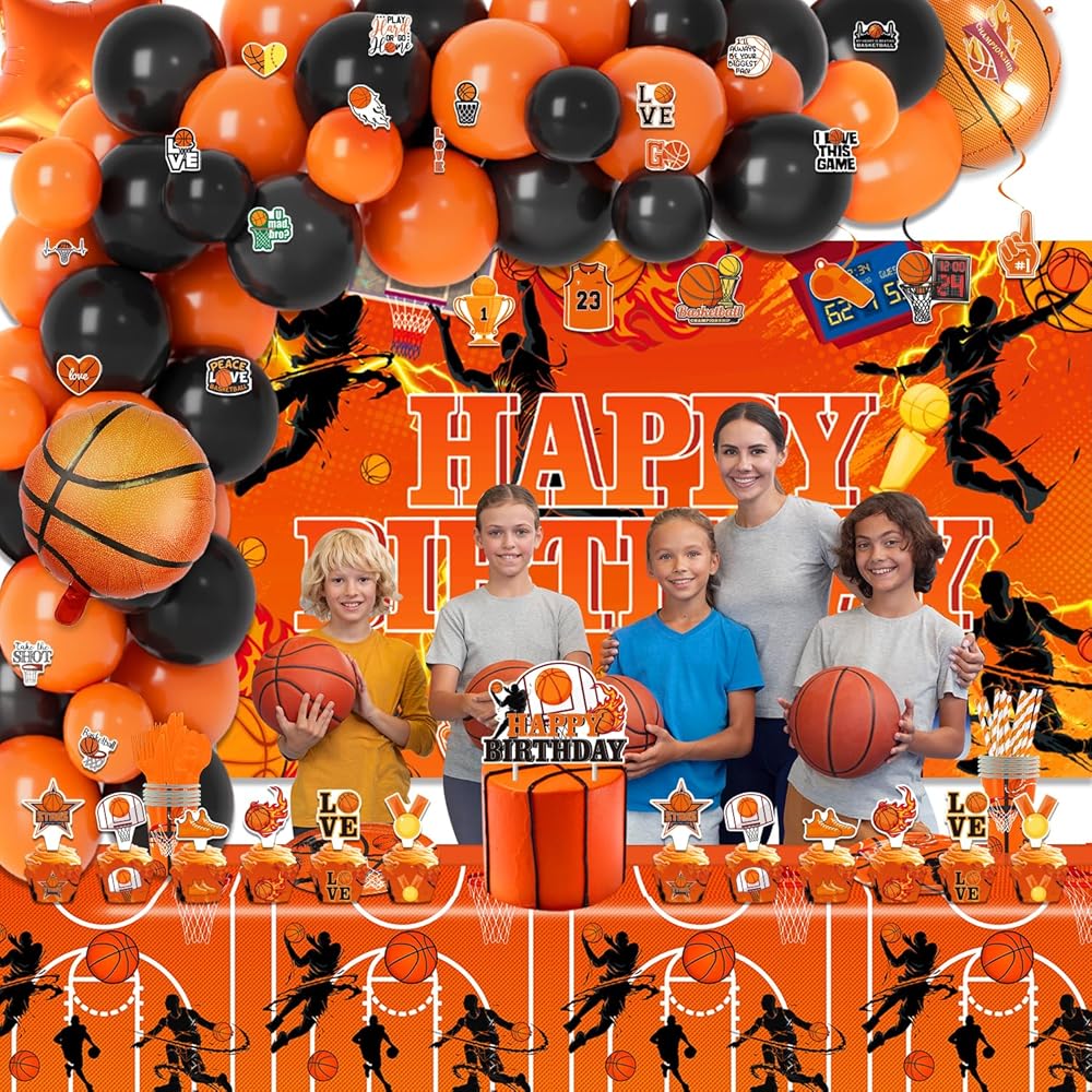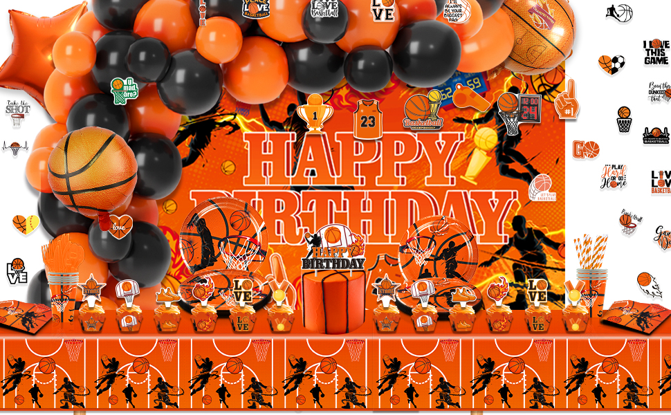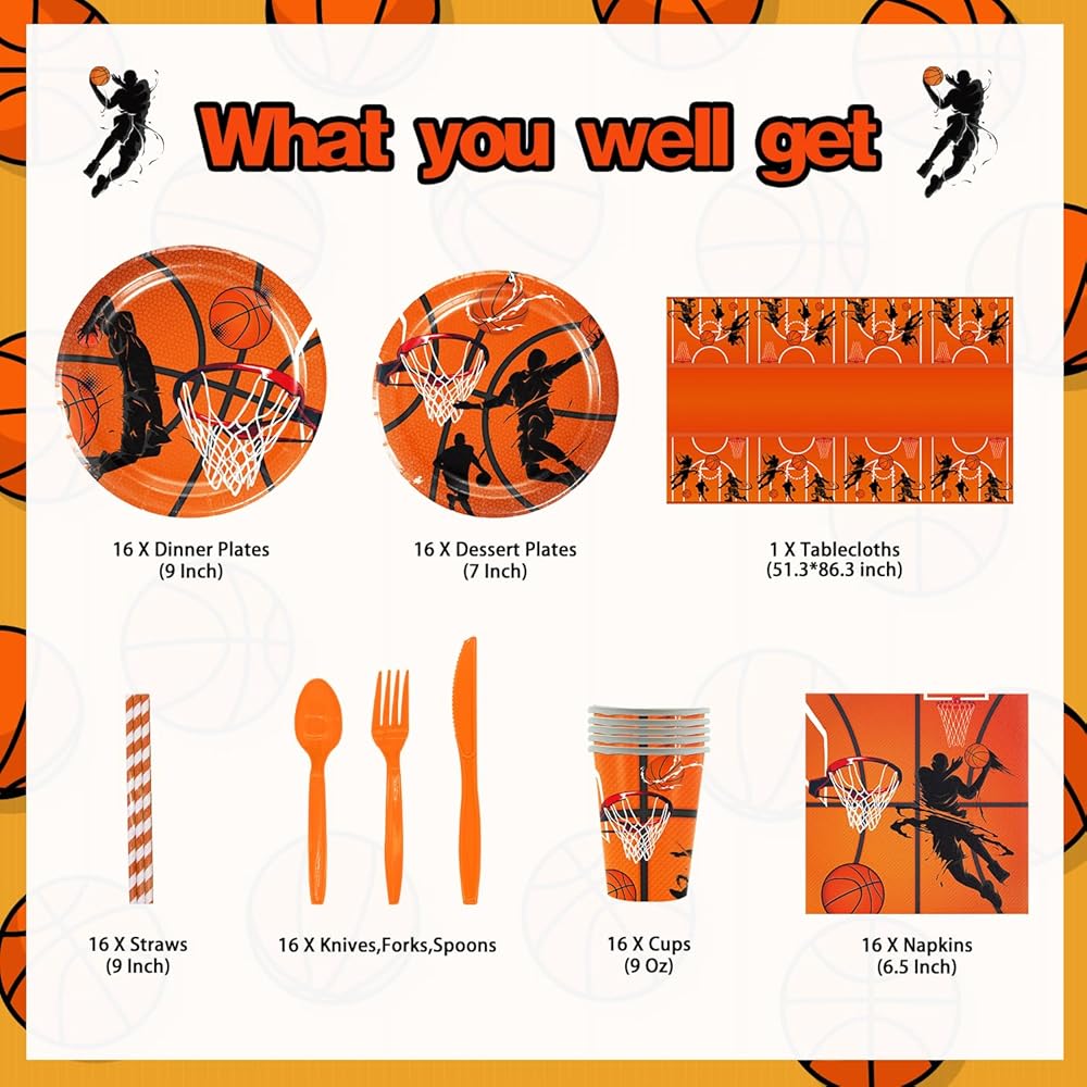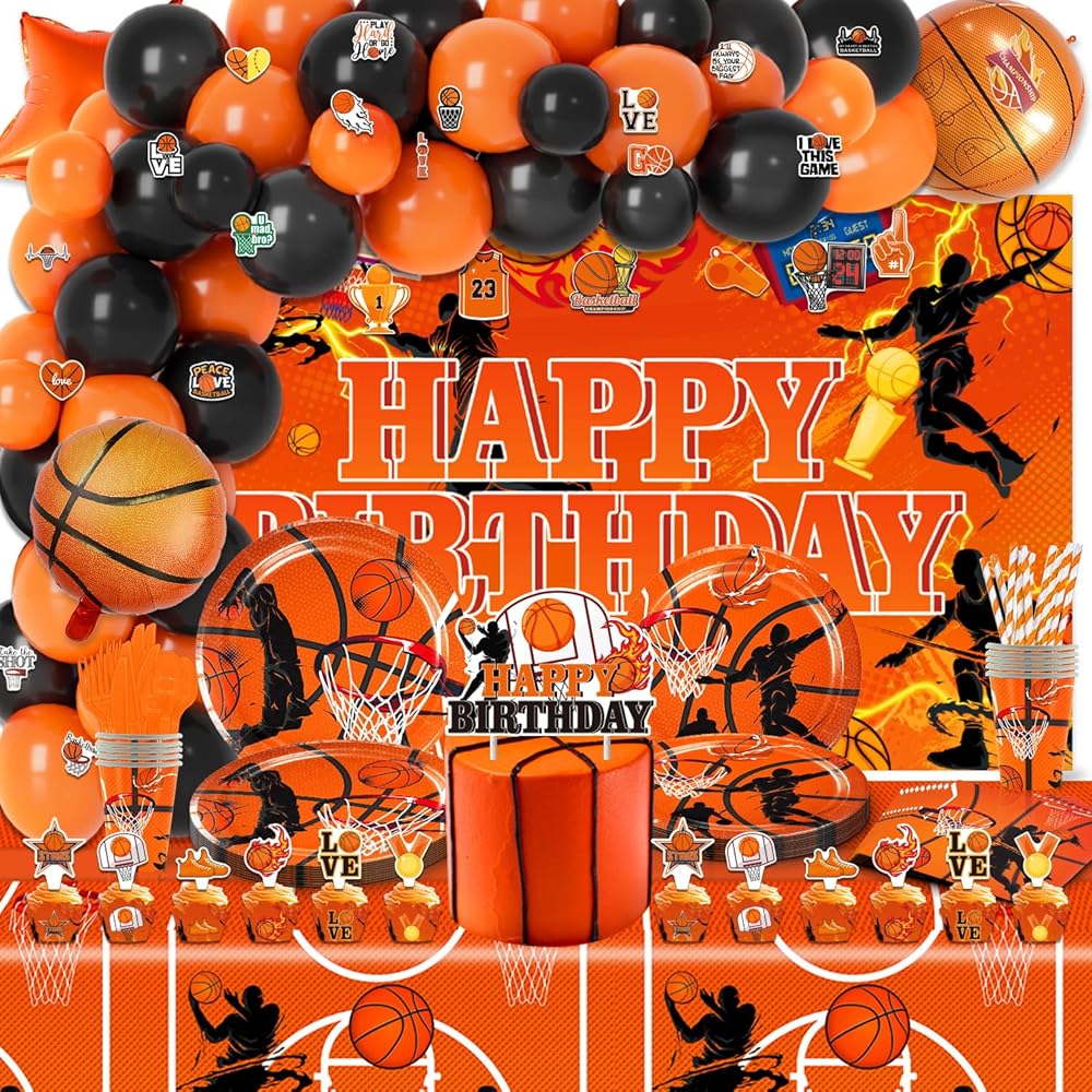 لوازم حفلات أعياد الميلاد لكرة السلة، 272 قطعة من ديكورات الحفلات ذات طابع كرة السلة للأولاد الصغار - الخلفية، الأطباق، الأكواب، المناديل، الأواني، الكعك، أغطية الكب كيك، أغلفة الكب كيك، البالونات، الدوامات المعلقة، مفارش المائدة، الملصقات تخدم 16 ضيفًا