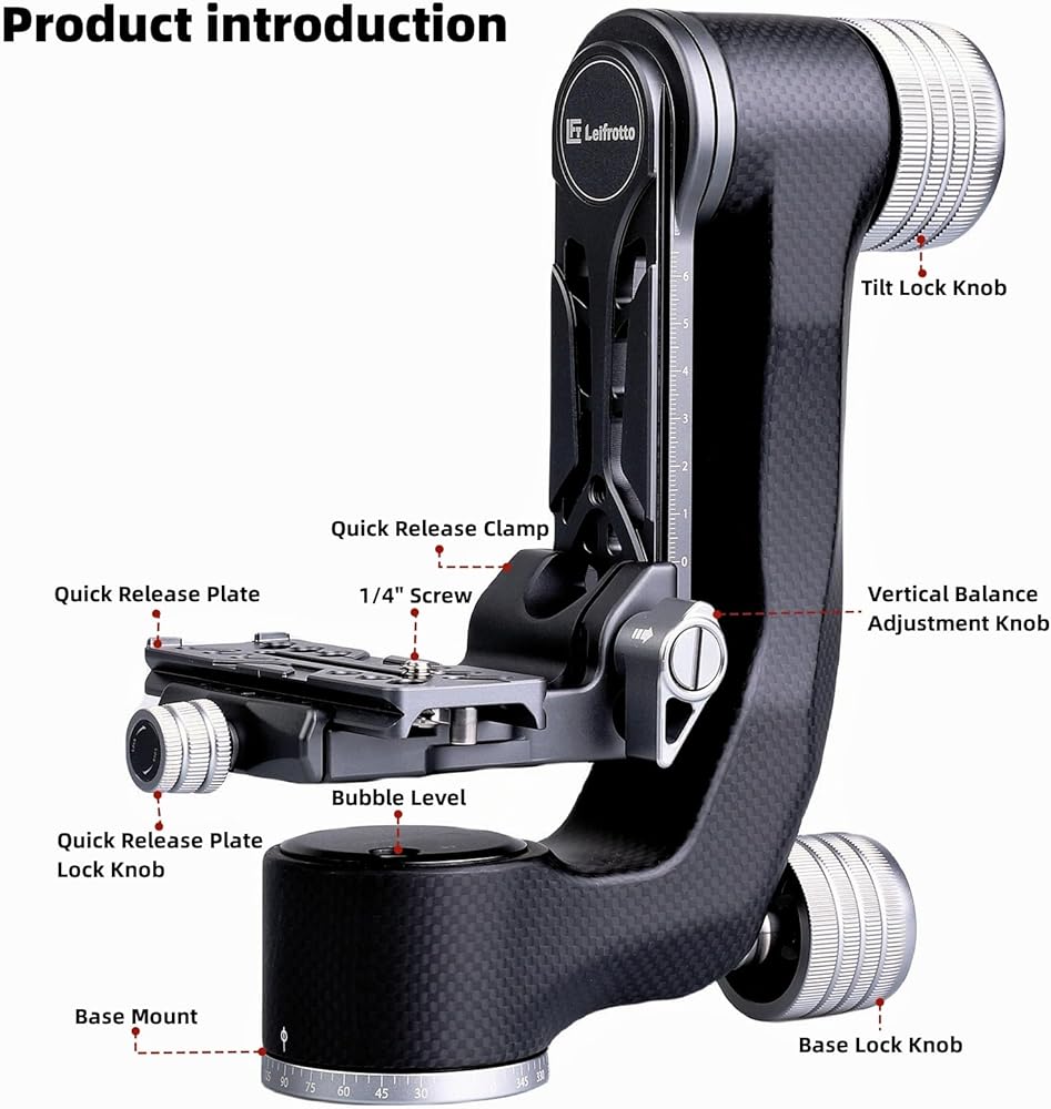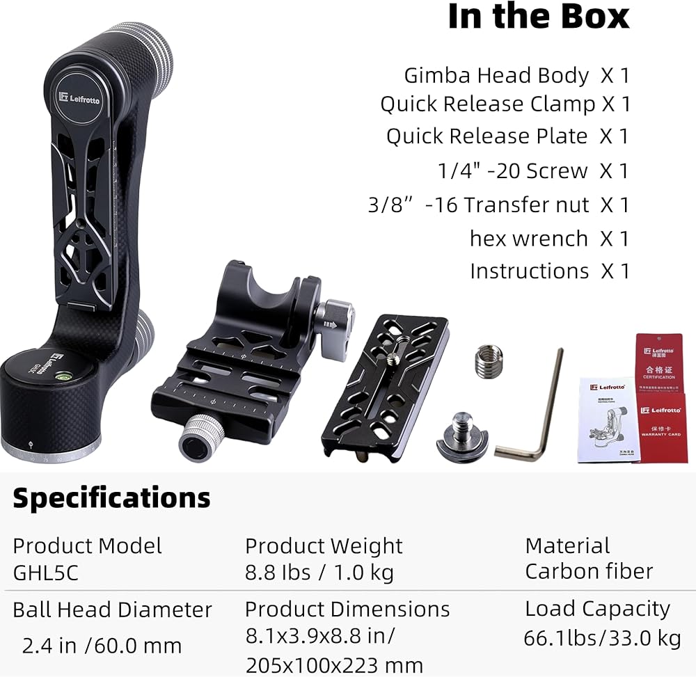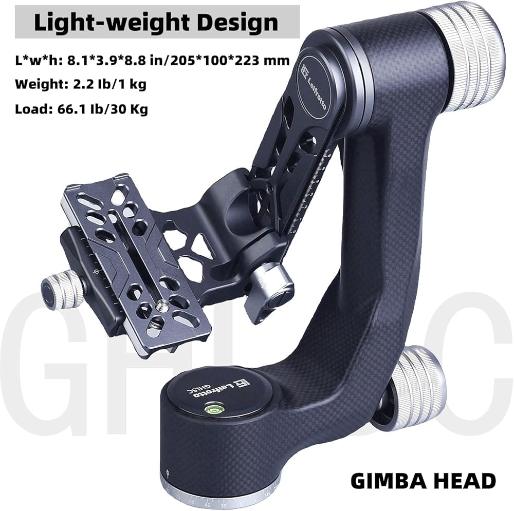 Gimbal Head for Mirrorless Cameras, Carbon Fiber with PL100N Plate (GHL5C).Arca-Swiss QR system Rock Solid support stiffness,GHL5C Supports Smoother 360 Degree Panoramic Shooting for DSLR Camera Up to 66.1lbs/30kg
