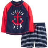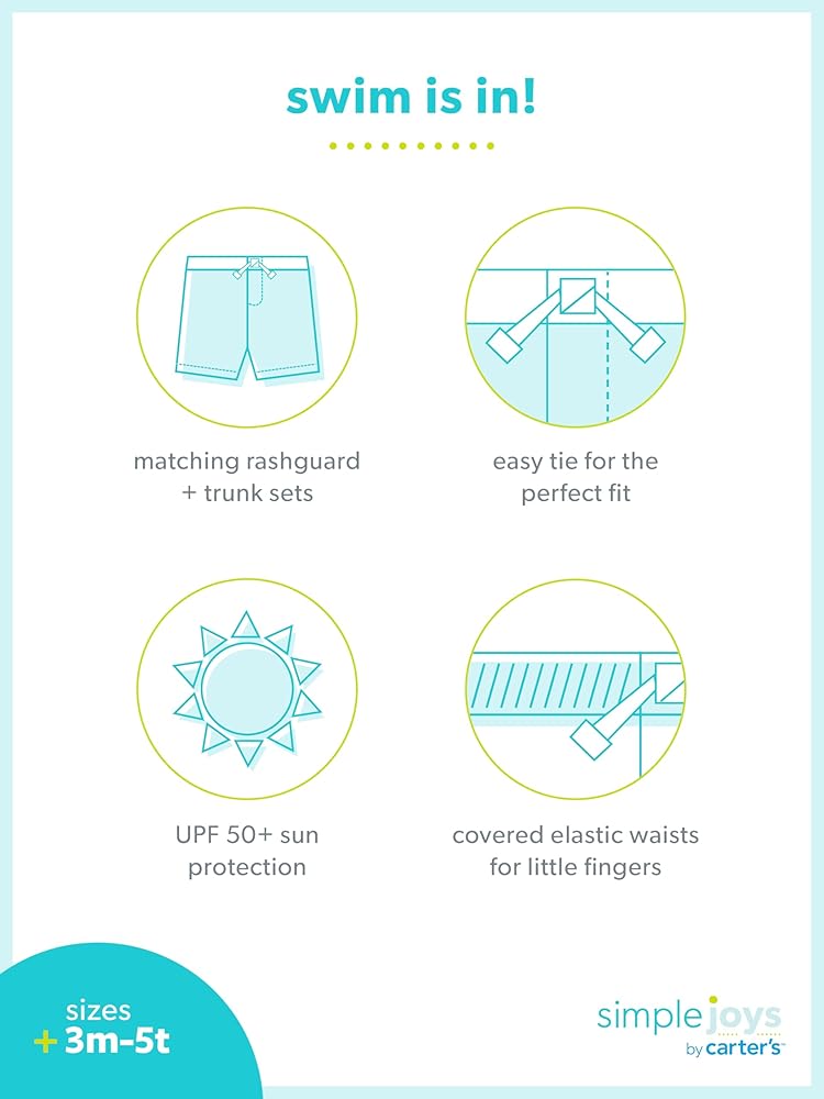 Lots of sun and water are on the schedule when you dress your handsome little one in this 2-piece rashguard set from Simple Joys by Carter's. The adorable print turns a regular day at the pool a mega splash of fun. This set protects baby's skin with UPF 50+ and the shorts feature a mesh lining and elastic waistband for a comfy fit.