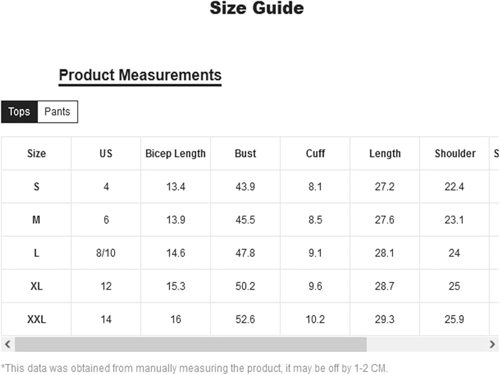Tops: Small: Bicep Length: 13.4", Bust: 43.9", Cuff: 8.1", Length: 27.2", Shoulder: 22.4", Sleeve Length: 19.1", Waist Size: 44.9"