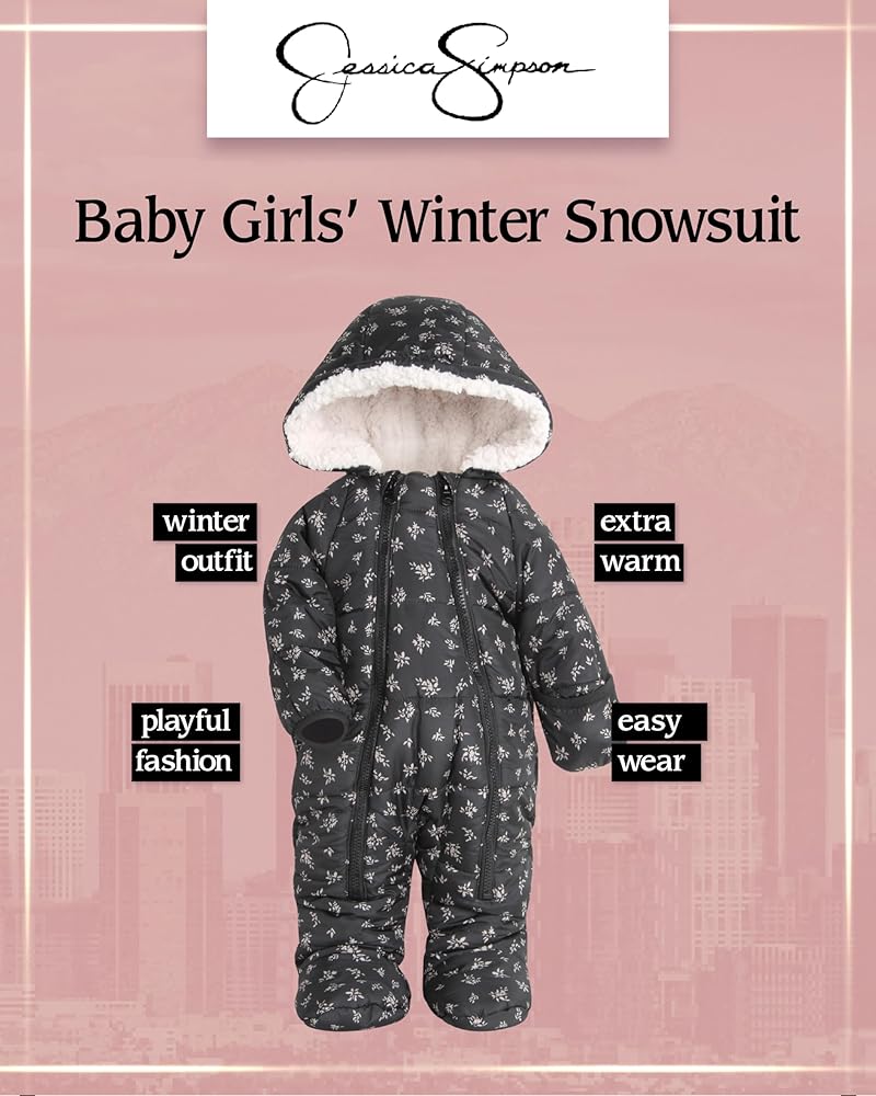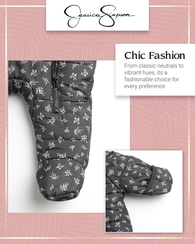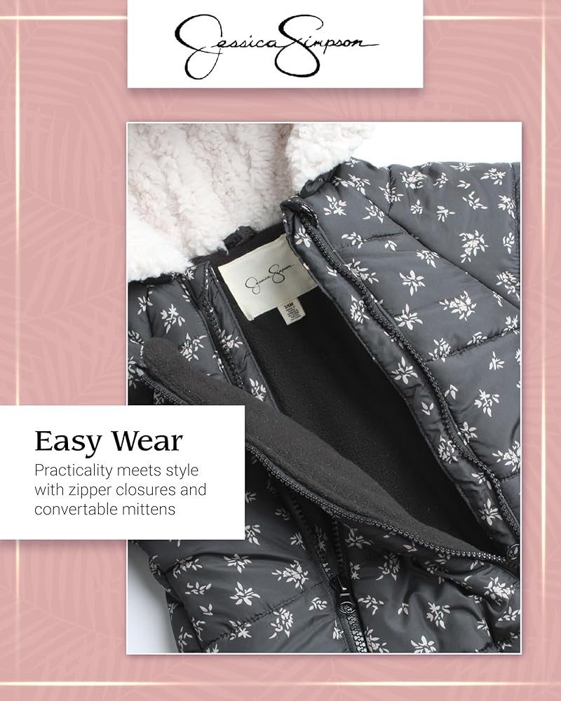 EASY ON: Dressing your newborn is trouble free with the convenient, secure, and reliable zipper closure; Featuring convertible mittens, and footies for extra warmth, this fleece-lined jumpsuit is ideal for baby girls who love playing outside, going to the park, and spending quality time with mommy; This stylish Jessica Simpson pram jumpsuit is a must-have for all parents and their baby girls