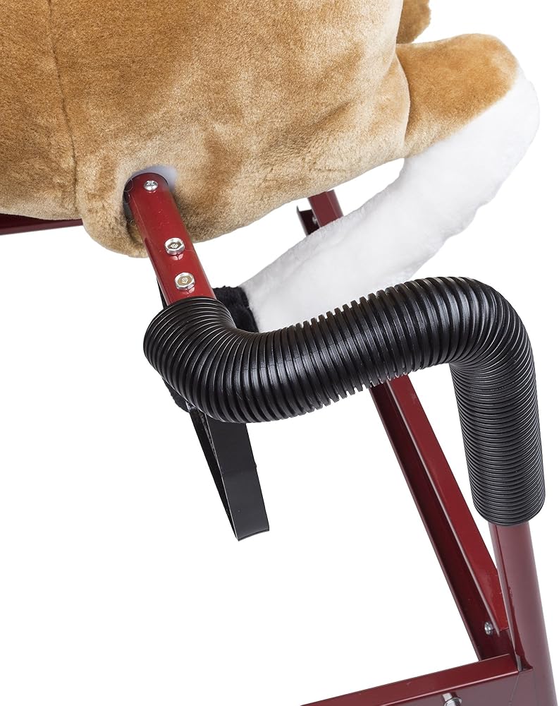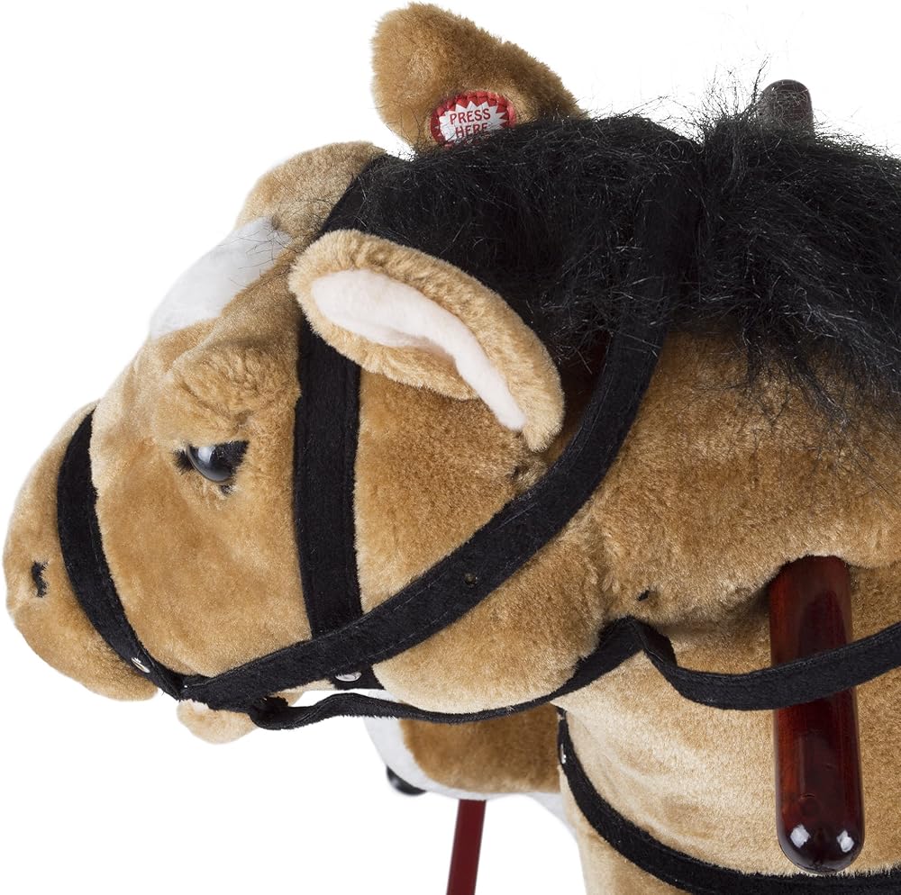 المميزات الخاصة - الحصان الهزاز ذا هابي تريلز، ناعم وقطيفة الملمس، مصنوع يدويًا وله مقابض خشبية من أجل التوازن. يتميز السرج والزمام، لذا يمكن لفروسيك الصغير توجيه صديقه الجديد. قم بتركيب بطاريتين AA (غير متضمنتين) تحت الحصان، وأضغط على زر الضغط هنا على الأذن، والحصان يصدر أصواتًا عصرية، على حد سواء حصان حقيقي.