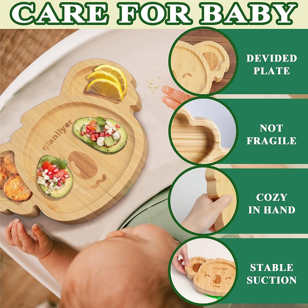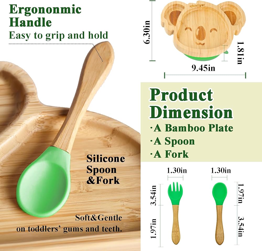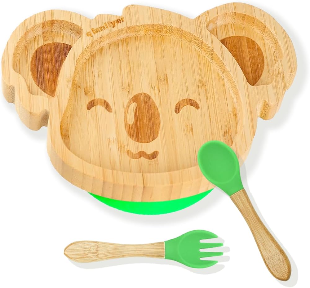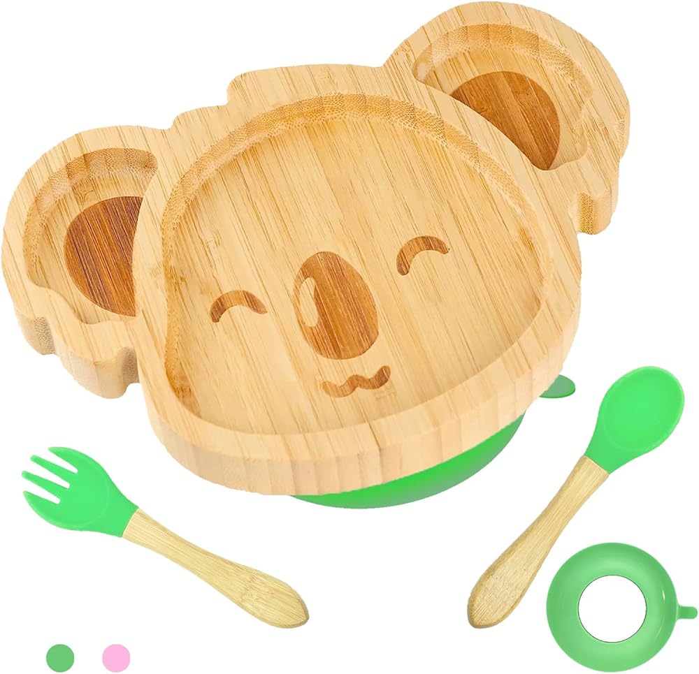 أطباق أطفال كوالا صغيرة رائعة من الخيزران من تشيانليير مع كوب شفط من السيليكون وملعقة وشوكة - مجموعة أطباق خشبية مقسمة للأطفال الصغار للفطام بقيادة الطفل - مستلزمات تغذية خالية من مادة BPA وغير سامة (أخضر)