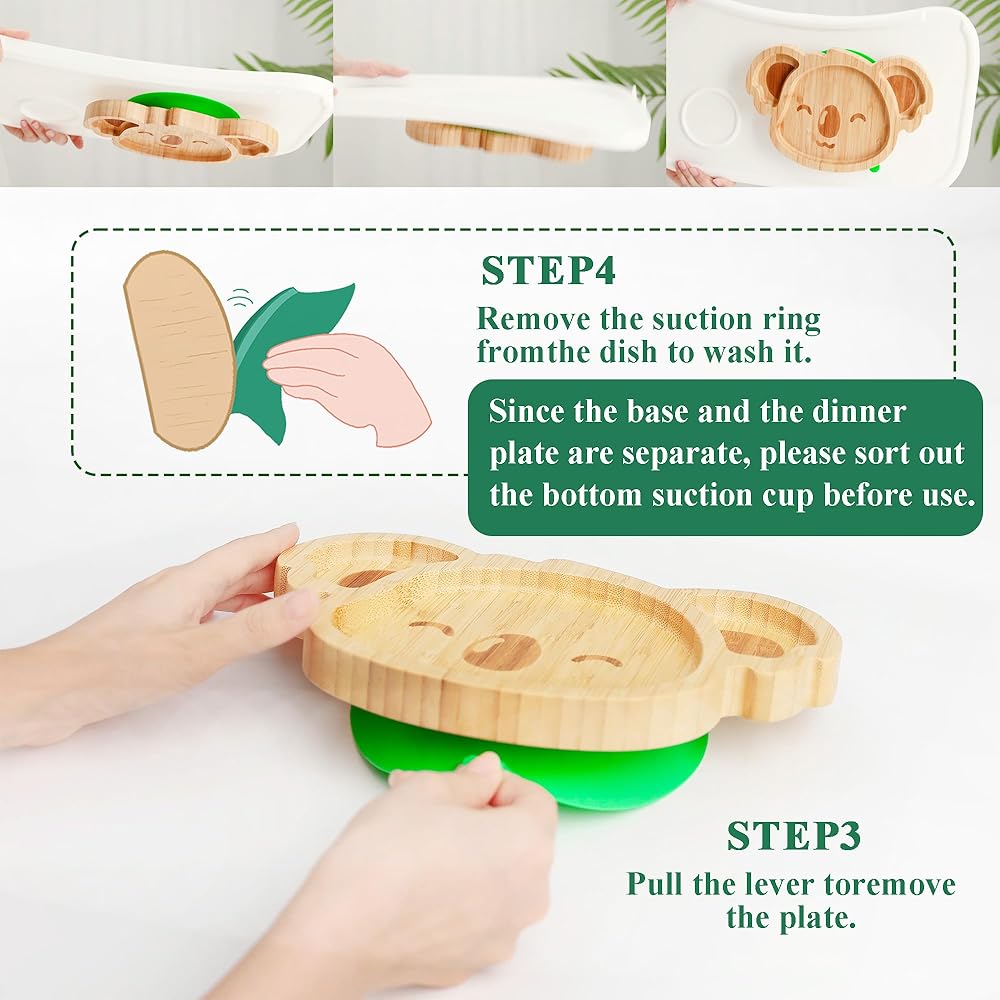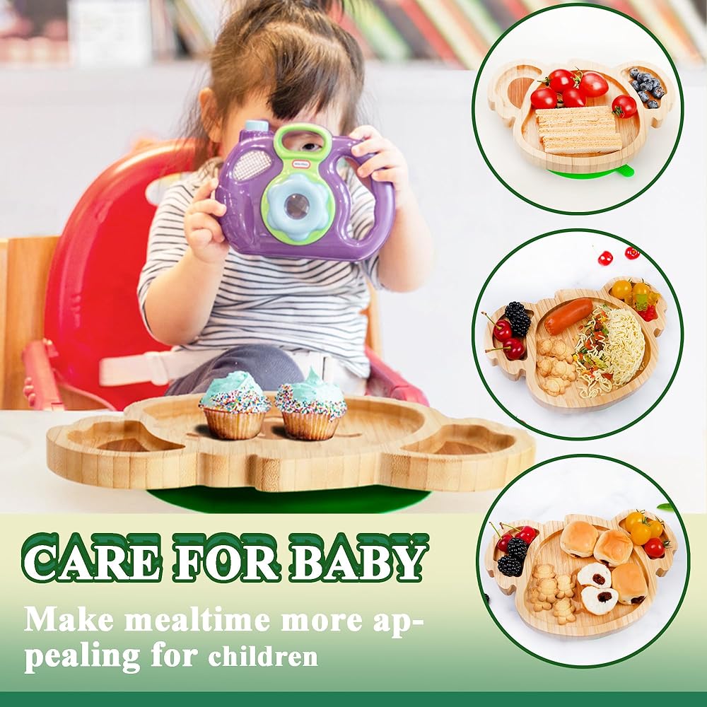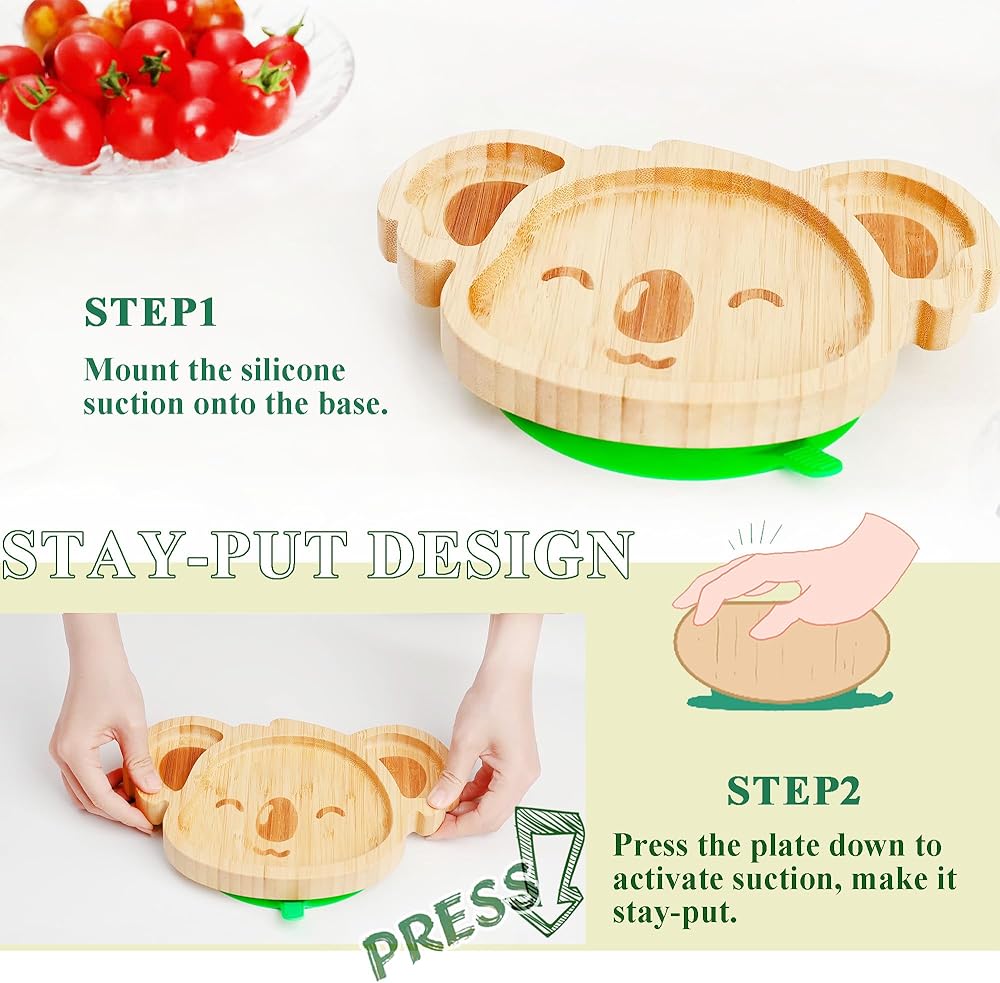 أطباق أطفال كوالا صغيرة رائعة من الخيزران من تشيانليير مع كوب شفط من السيليكون وملعقة وشوكة - مجموعة أطباق خشبية مقسمة للأطفال الصغار للفطام بقيادة الطفل - مستلزمات تغذية خالية من مادة BPA وغير سامة (أخضر)