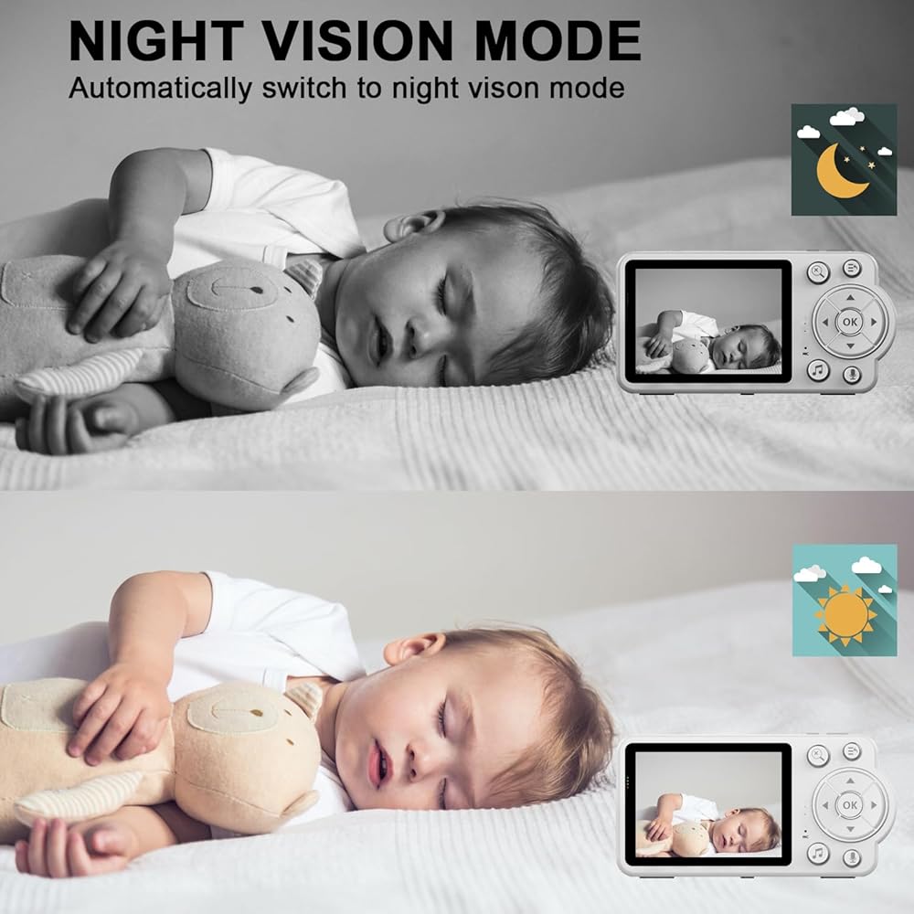 【شاشة مراقبة للأطفال مقاس 2.8 بوصة مع كاميرا لاسلكية】 يستخدم المضيف شاشة عرض TFT عالية الوضوح مقاس 2.8 بوصة بدقة شاشة 240 * 320، تدعم الرؤية الليلية للكاميرا مسافة فعالة تبلغ 0-5 أمتار، مما يسمح برؤية واضحة للطفل كل حركة يقوم بها الطفل في الليل.