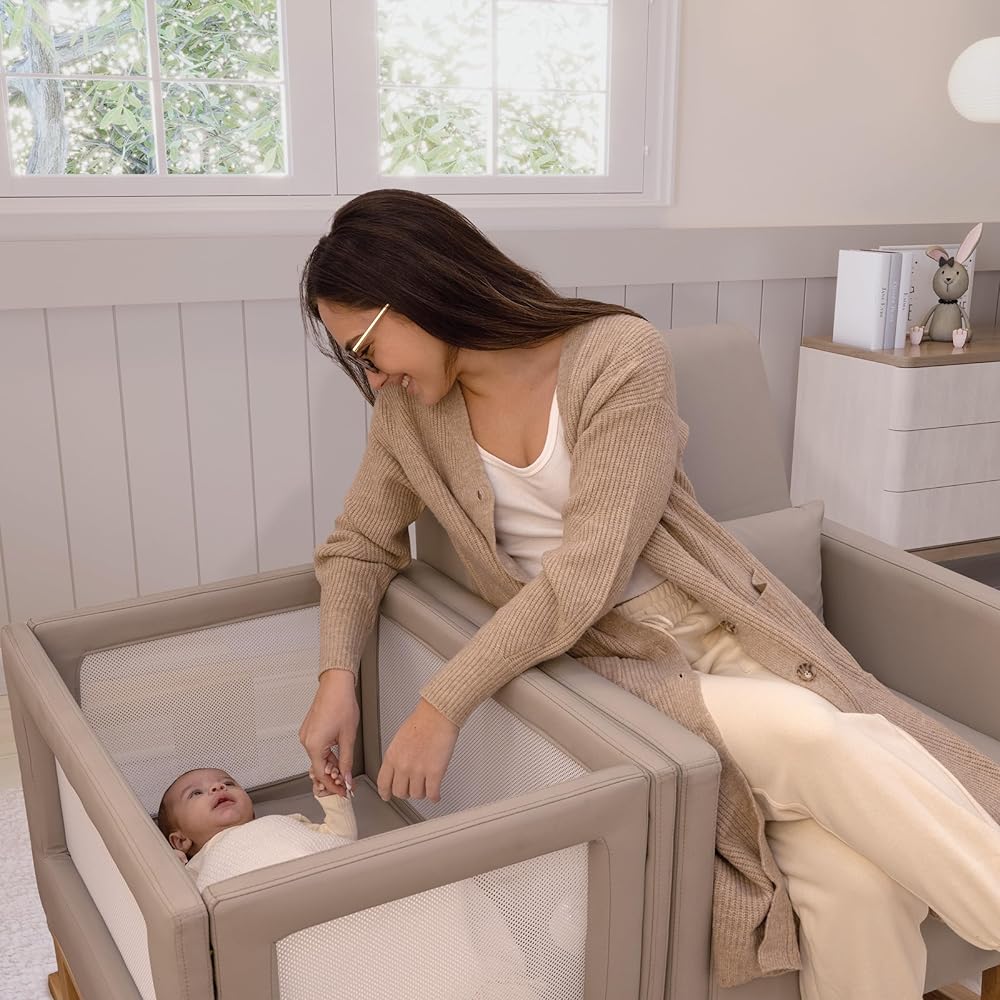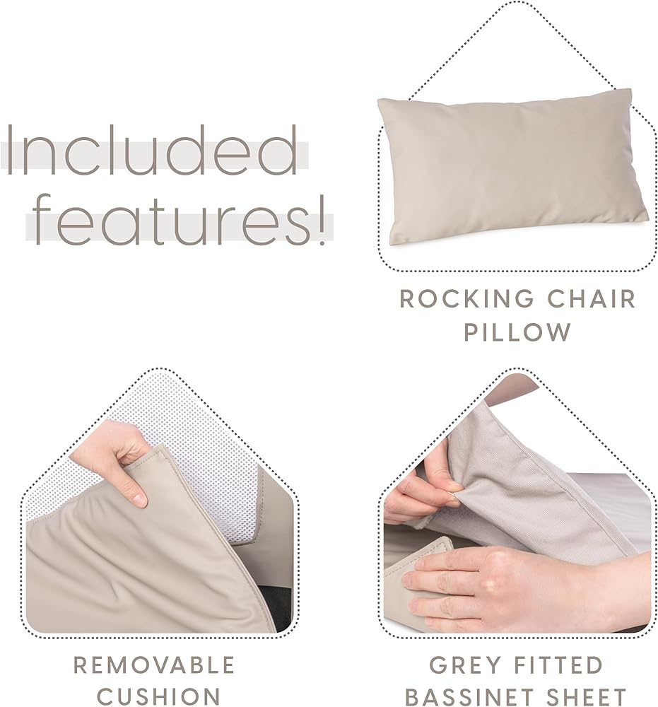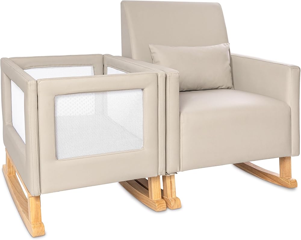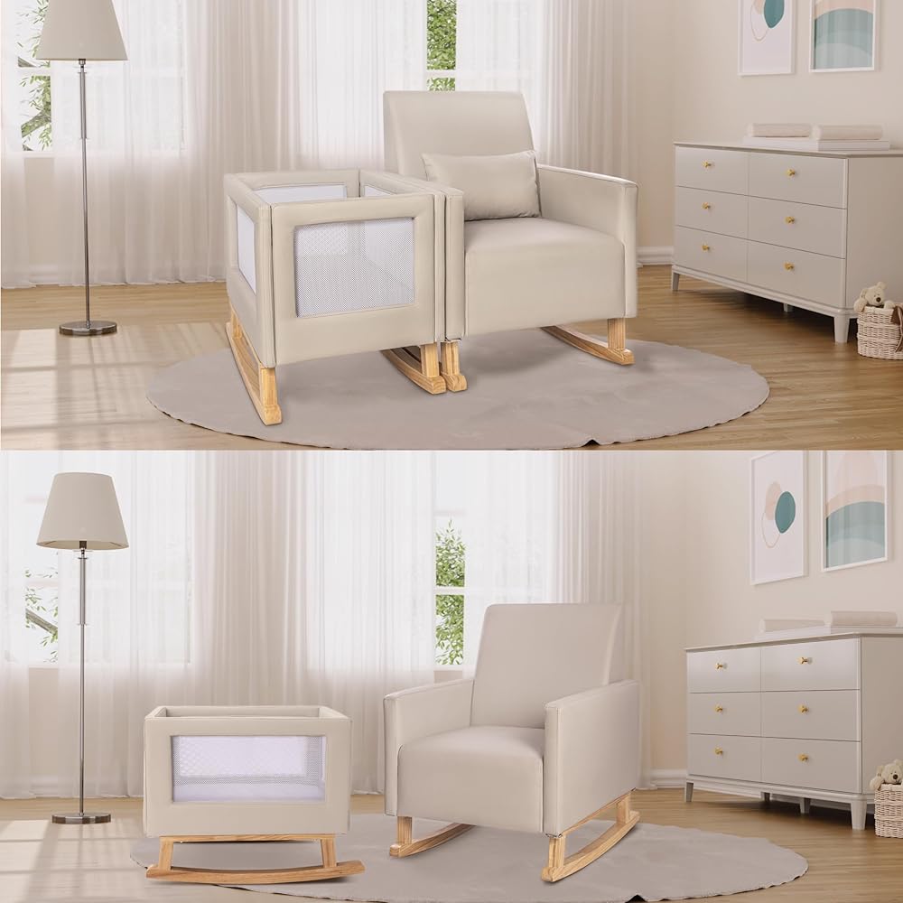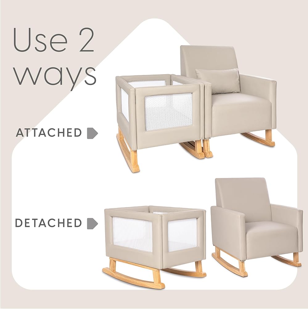 This milliard nursery rocker bassinet and rocking chair offer a versatile and convenient solution for parents. While they are firmly attached to create a clean and cohesive combination, they can also be easily unattached, allowing each piece to be used independently. The bedside crib is designed to keep your little one close by, ensuring they are within arm's reach at all times. The rocker and bassinet provide a comfortable and secure environment for your baby, allowing you to rock them gently while keeping them safe. This design also allows parents to have their hands free to hold a book or a bottle, making it easier to multitask. The crib features breathable mesh sides, which promote airflow and provide visibility, allowing you to keep an eye on your baby at all times. The soft leather fabric adds a touch of luxury and comfort. The gentle rocking motion of the crib is soothing for babies, contributing to their overall happiness and well-being. Whether you choose to use the rocker and bassinet together or separately, this milliard nursery set offers convenience, comfort, and versatility for both parents and babies alike.