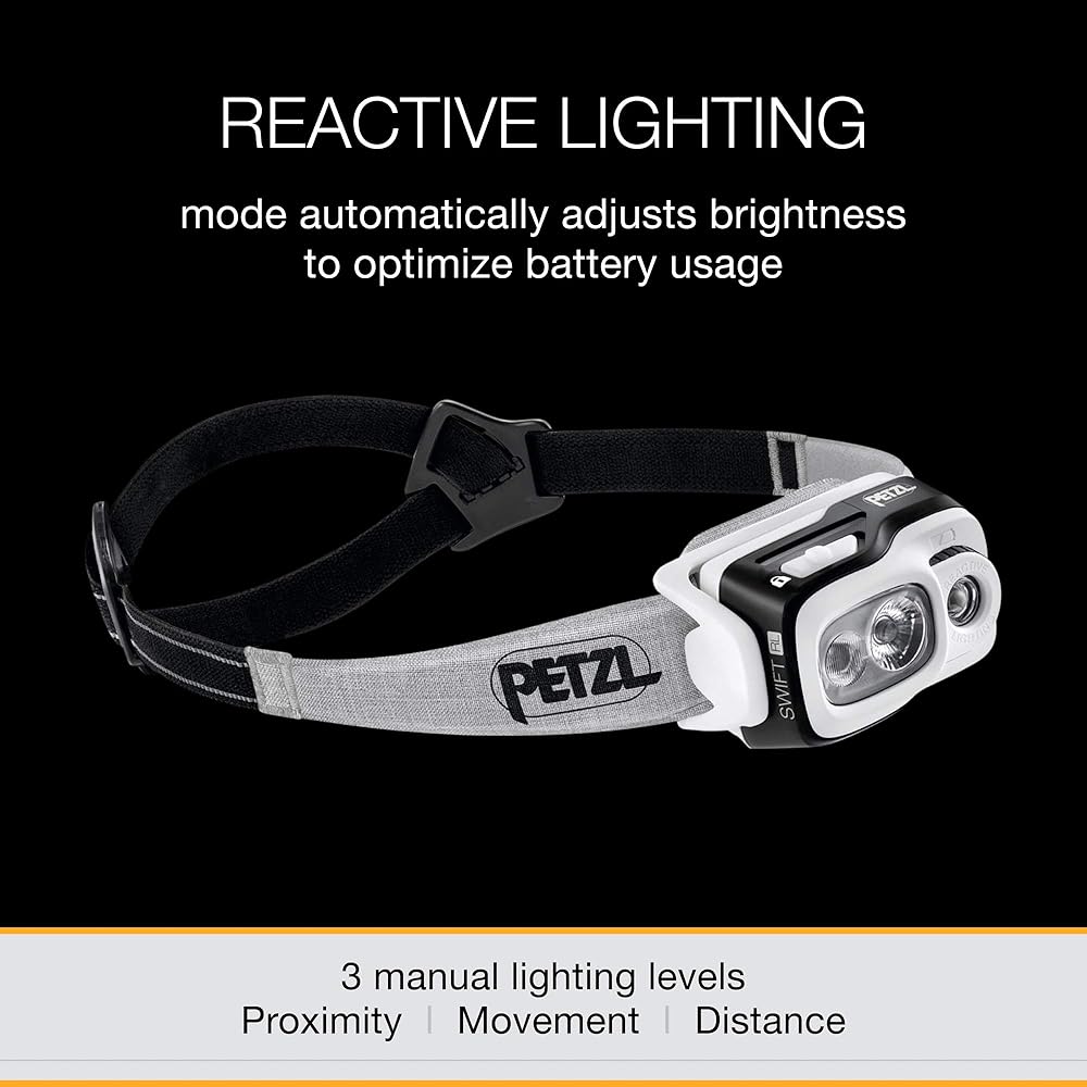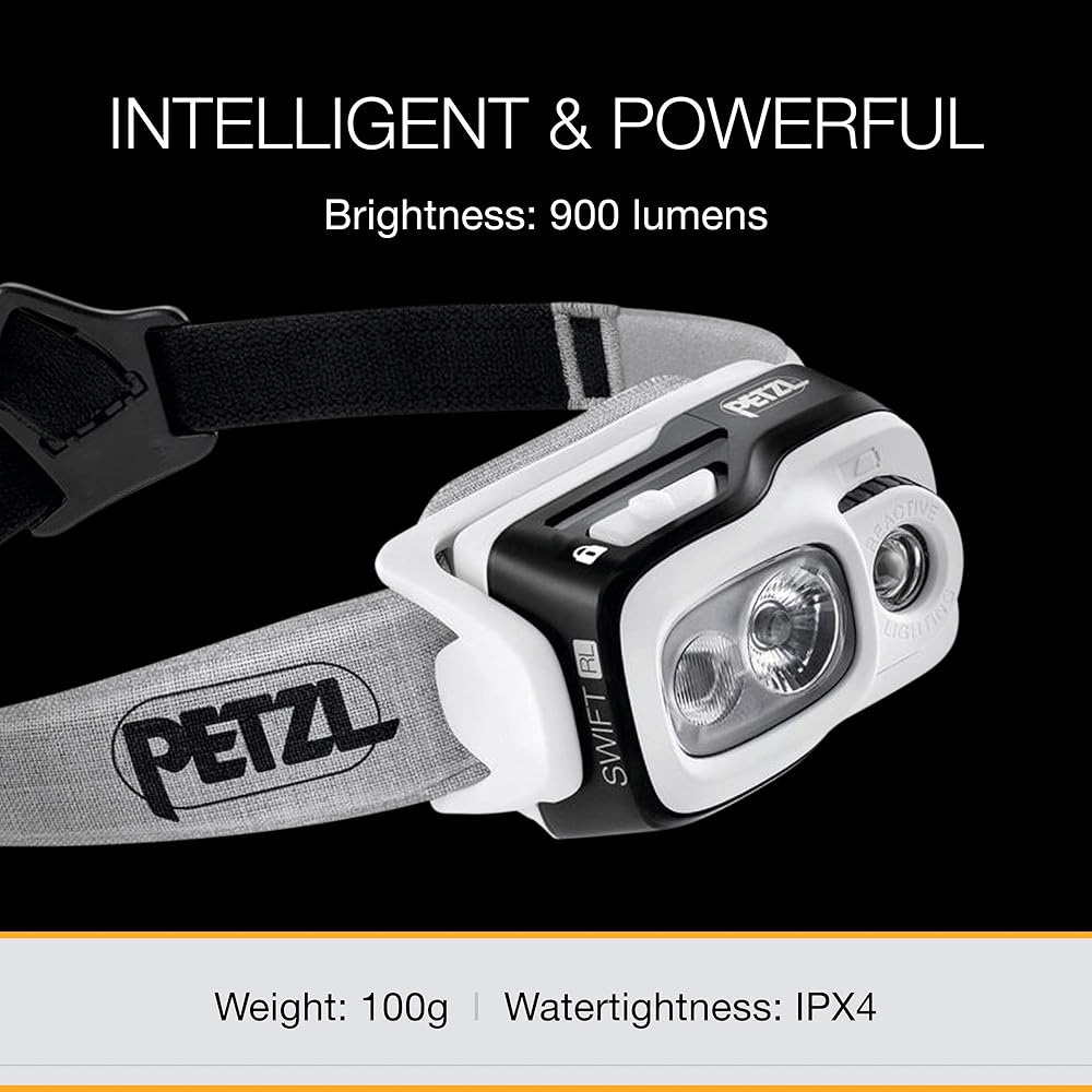قوية وخفيفة الوزن: توفر Swift RL 900 لومن في 100 جرام فقط، مما يجعلها واحدة من أقوى المصابيح الأمامية المدمجة من Petzl؛ يوفر ما يصل إلى 100 ساعة من عمر البطارية ومسافة تصل إلى 150 مترًا