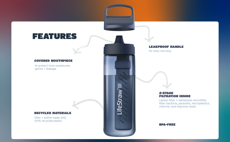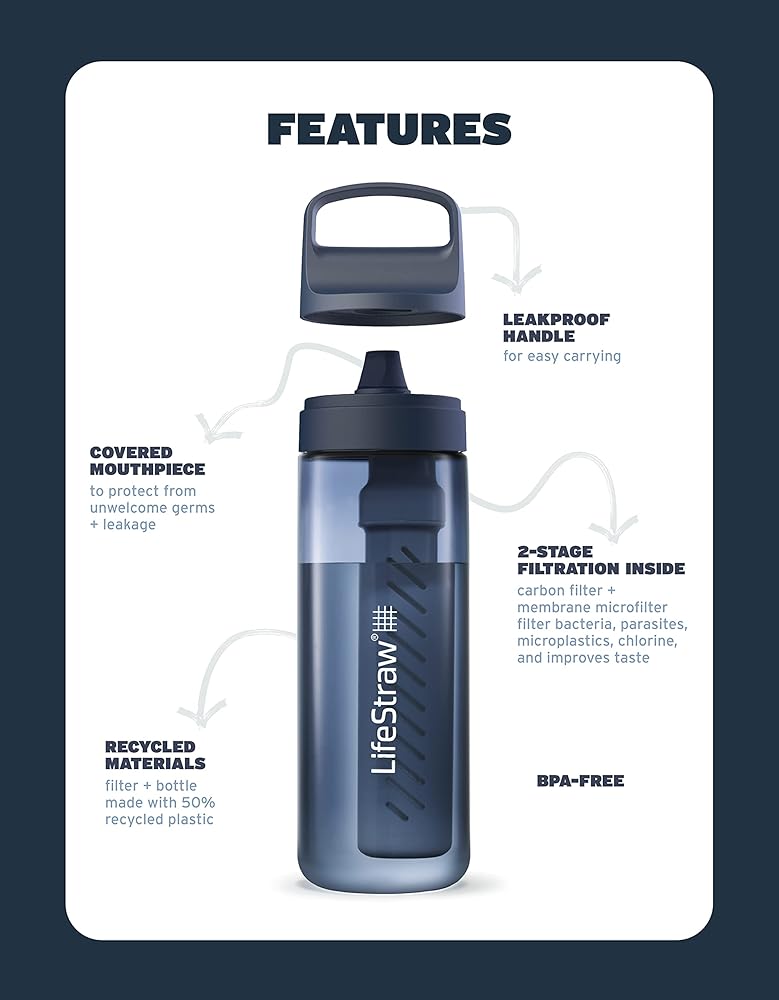 LifeStraw Go Series is the ultimate sidekick for safer, better-tasting water for travel and everyday use. The BPA-free bottle filters out nasties, so you can fill up from airport bathrooms, a tap in Mexico, or a gas station while road-tripping. The advanced 2-stage filter improves taste and protects against bacteria, parasites, microplastics, chlorine, silt, sand, and cloudiness. The BPA-free bottle is made from 50% post -consumer recycled plastic. Do good on the go and avoid single-use plastic bottles. For every purchase, a child in need receives to safe drinking water for a year.