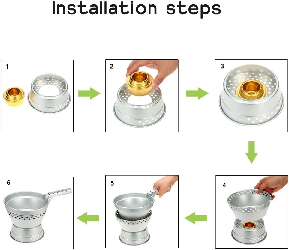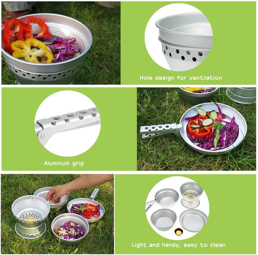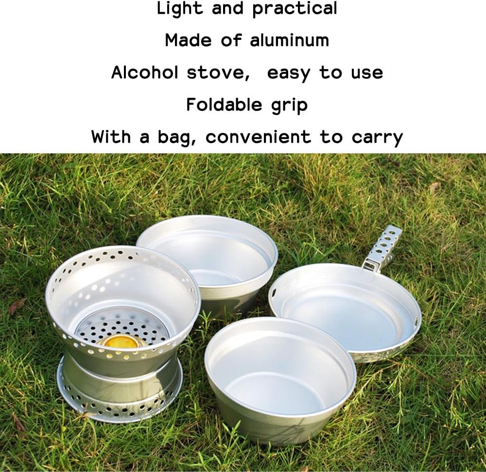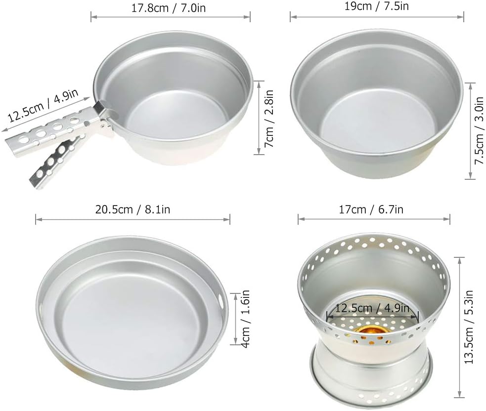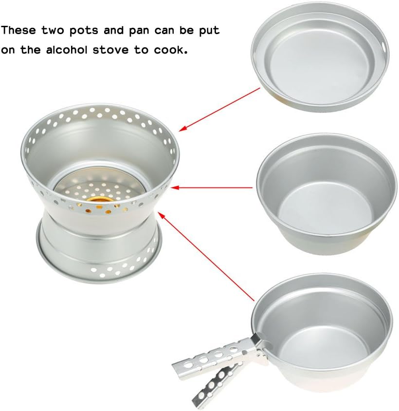 Includes 2 x pot, 1 x frying pan, 1 x alcohol stove, 1 x stand set for alcohol stove, 1 x pot gripper.