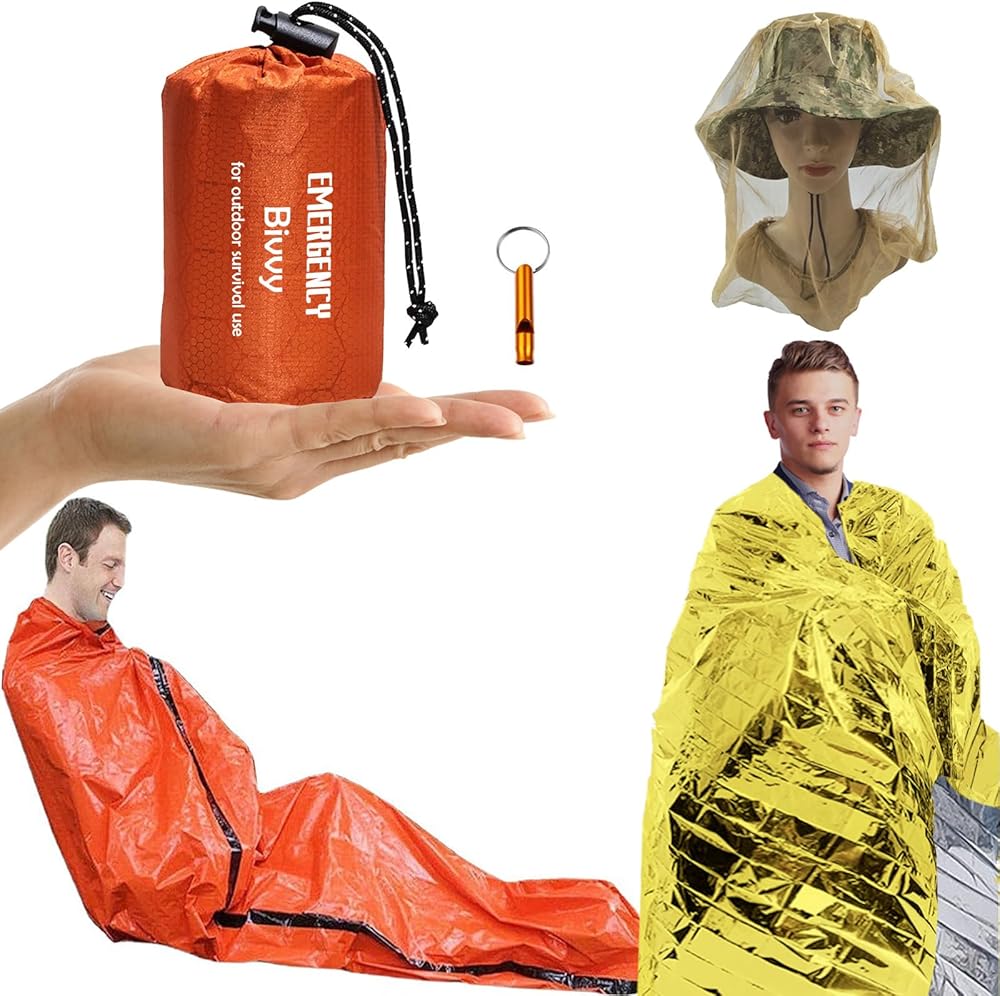 Emergency Sleeping Bags Thermal Blankets Mosquito Head Net Mesh Set 3 Pack, Survival Bivy Sack Survival Gear for Hiking, Camping, First Aid Kits, Outdoor Survival Gear