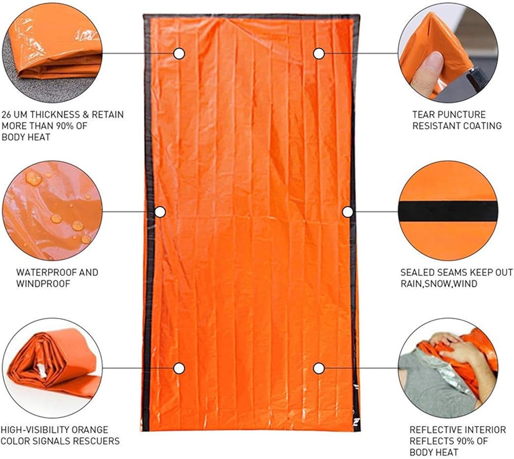• Emergency Sleeping Bags(1X Pack, Material: PE, Color: Orange, Size: 91CM X 215CM), Emergency Thermal Blankets (1X Pack, Material: PE, Color: Orange, Size: 130CM X 230CM), Mosquito Head Net Mesh (1X Pack, Material: PE, Color: Orange, Size: 50CM X 55CM), 1X Whistles, 2X Pack Orange Storage Bag, Survival Bivy Sack Survival Gear for Hiking, Camping, First Aid Kits, Outdoor Survival Gear