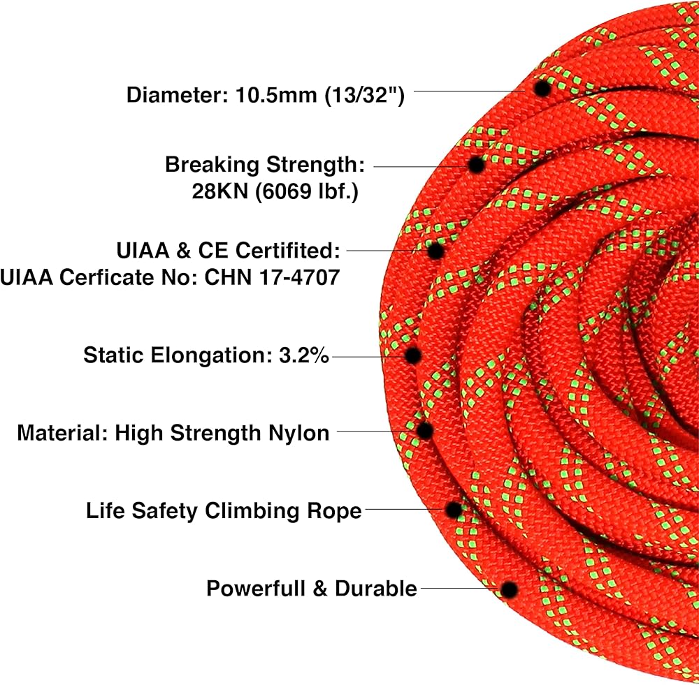 حبل تسلق الصخور الثابت من فيريكسوس 10.5 ملم - 30 متر (100 قدم) حبل نايلون شديد التحمل لتسلق الجبال في الهواء الطلق، والهبوط بالحبل، وتسلق الأشجار، وتسلق الجليد، والإنقاذ والهروب
