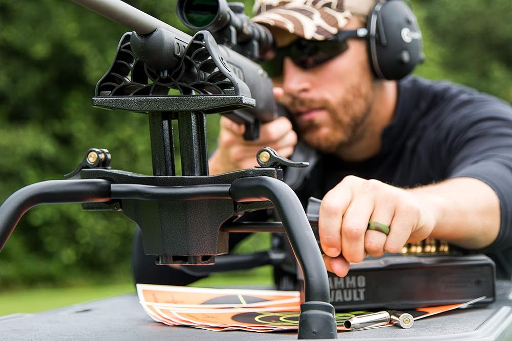 CONVENIENT: Features a molded, weatherproof seat for prolonged shooting comfort and a perimeter rail to keep ammunition from rolling off the benchtop with a quick-release pin for easy takedown and molded carrying handles to allow for easy transport