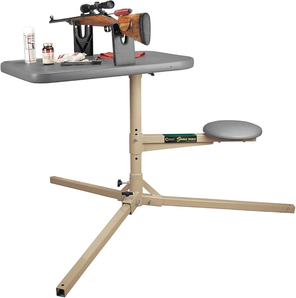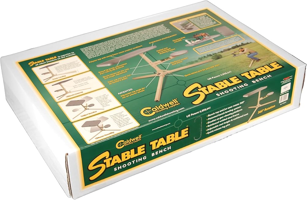 The Stable Table is purpose-built to be the finest value-priced shooting bench on the market. The tripod design is more rigid and has fewer joints than folding-style benches and is appropriate for a wider variety of shooting conditions. The central shaft, seat and tabletop all pivot allowing the user to make shots at any angle from a single setup – ideal for varmint hunting. The Stable Table breaks down into seven pieces and weighs a total of 60 pounds.