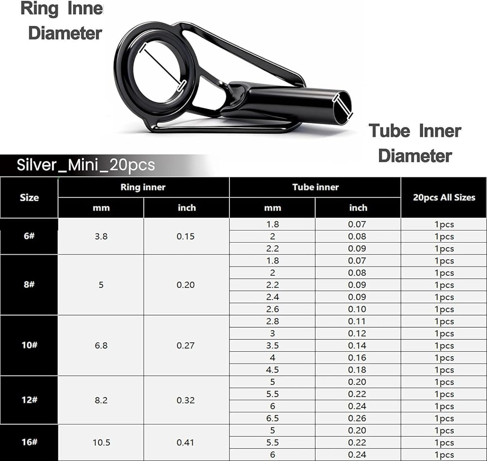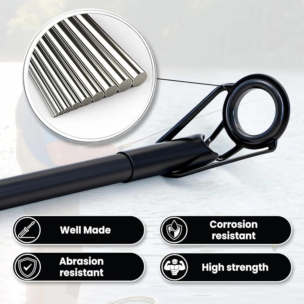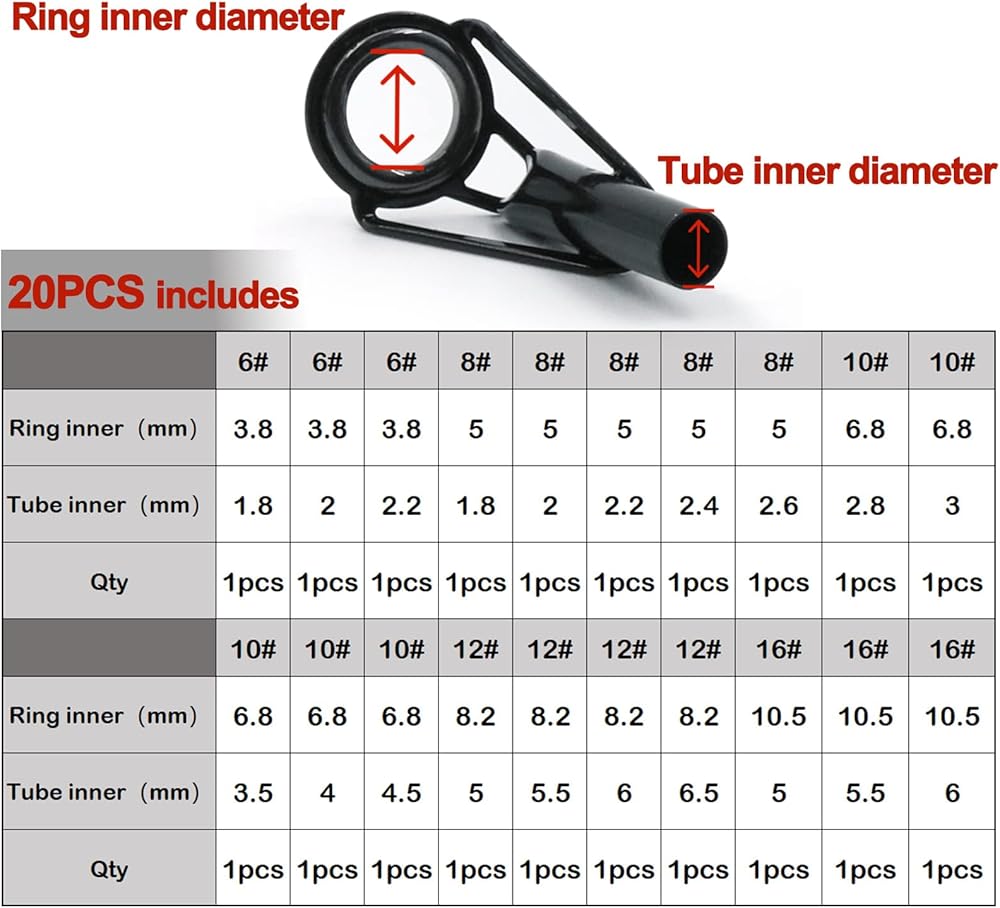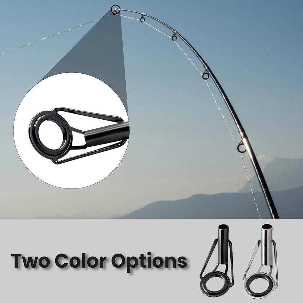 طقم إصلاح طرف قضيب FishTrip: أطراف صنارة الصيد مصنوعة من إطار من الفولاذ المقاوم للصدأ مع حلقة من السيراميك، وهي متوفرة بإجمالي 24 مقاسًا، لتلبية الأنواع المختلفة من قضبان الصيد التي يمتلكها الصيادون المحترفون. يتوفر كل من الصيد في المياه العذبة والمياه المالحة/البحر. .