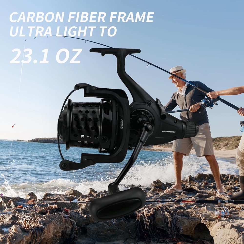 تحتوي بكرات الصيد القوية من سلسلة HISHARK ID على غسالات سحب من ألياف الكربون لما يصل إلى 33 رطلاً / 15 كجم من سحب ألياف الكربون لبكرة الصيد