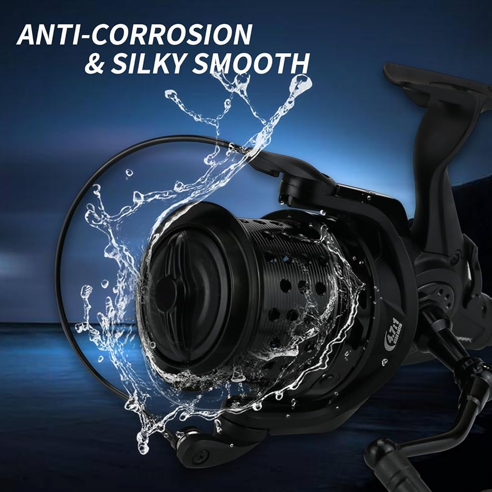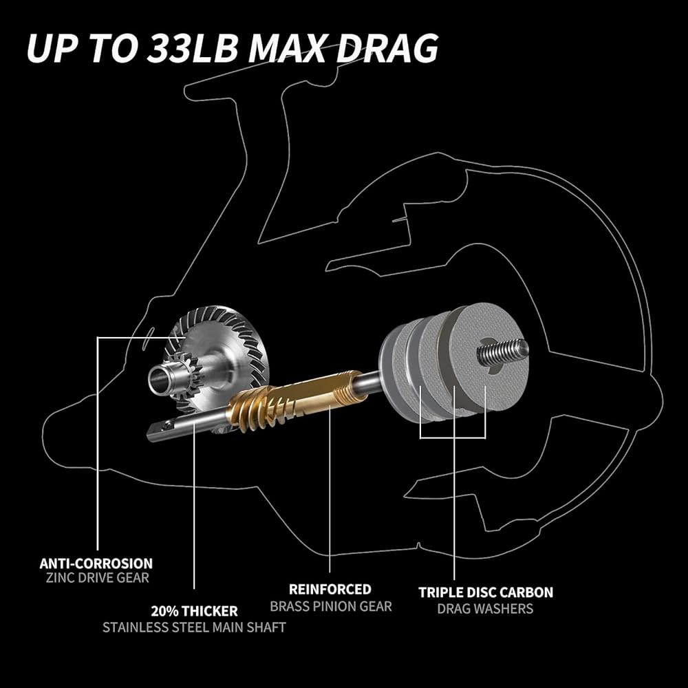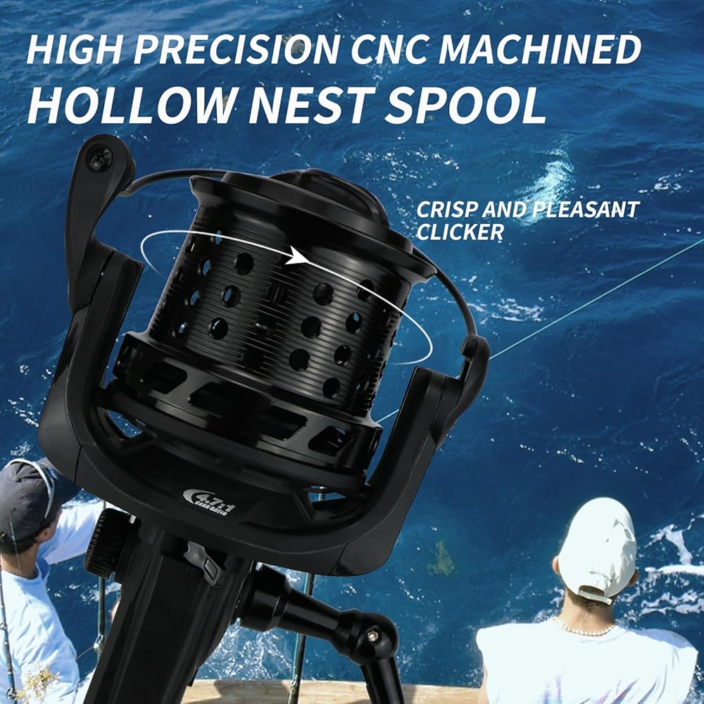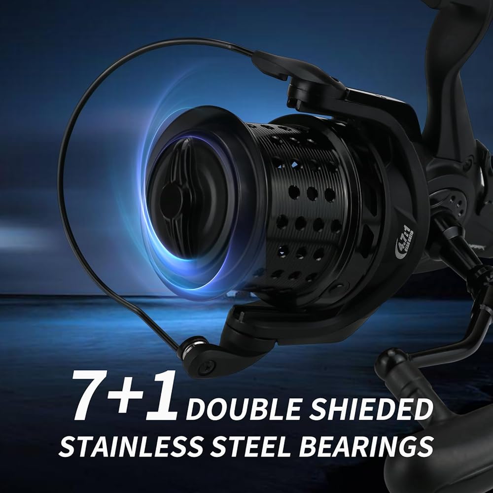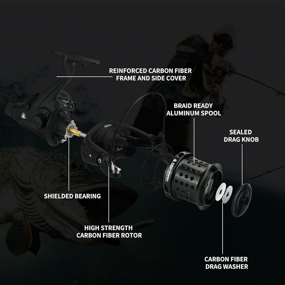 بكرة الصيد الدوارة، 7+1 محامل كروية من الفولاذ المقاوم للصدأ، نسبة تروس 4.7:1، أقصى سحب 33 رطل، جسم من ألياف الكربون، سحب لحركة صيد الطعم المباشر، سلسلة ID 8000