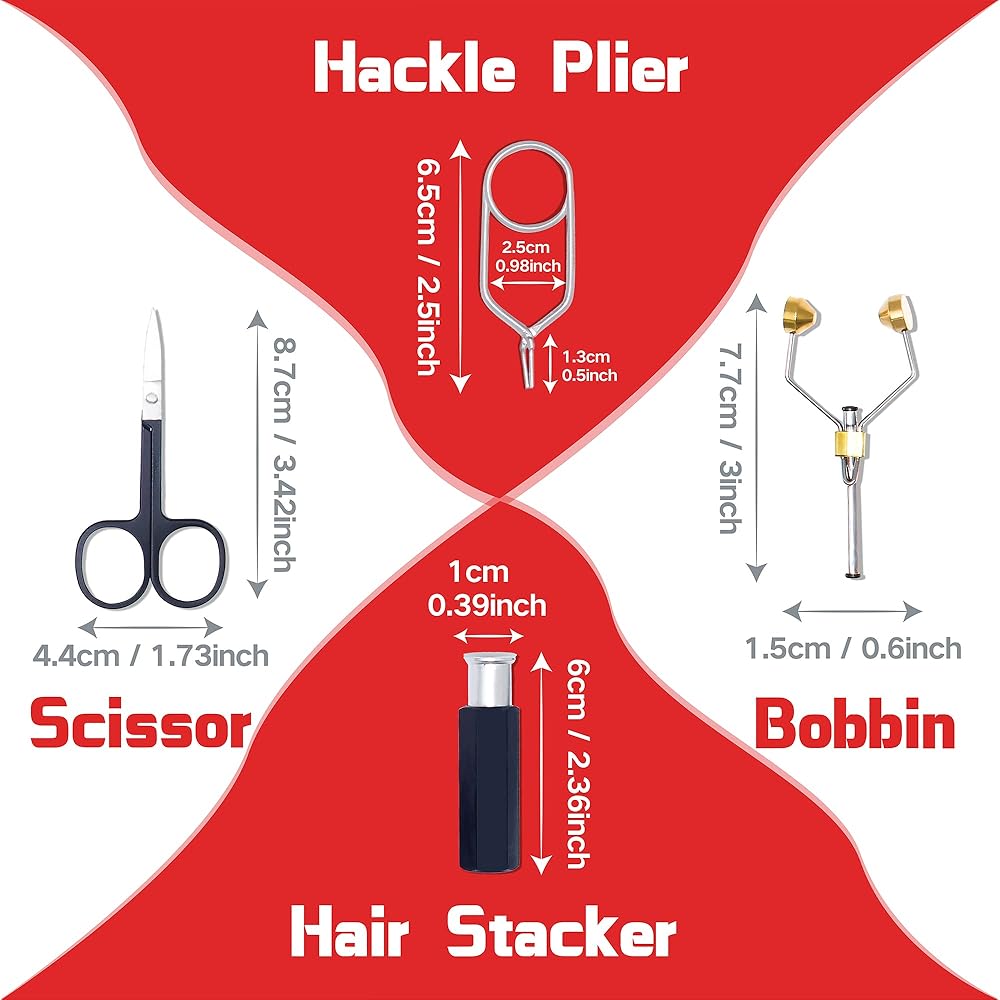 【أدوات احترافية لربط الذبابة】: مجموعة أدوات ربط الذبابة، مجموعة كاملة من الأدوات تتضمن بكرات خيط بودكين سوط، مقص شعر، مكدس شعر، كماشة دبلجة تويستر، فرشاة ملقط متعددة الأغراض، أداة ربط الذباب الأكثر اكتمالًا المتاحة.