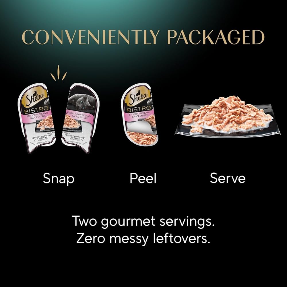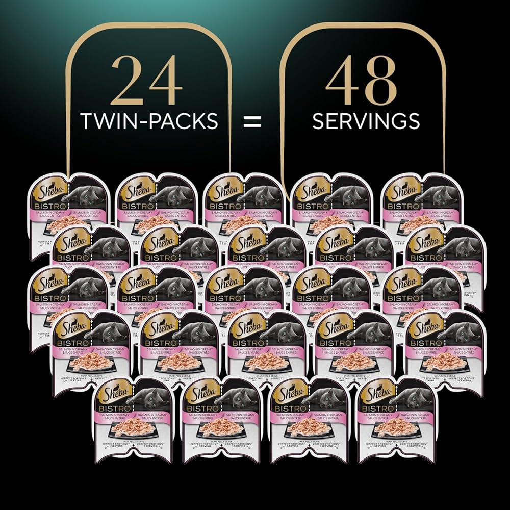 شيبا بيرفكت بورشنز بيسترو طعام القطط الرطب للبالغين، سمك السلمون في صلصة كريمية، 2.6 أونصة. صواني مزدوجة العبوة (24 قطعة، 48 حصة)