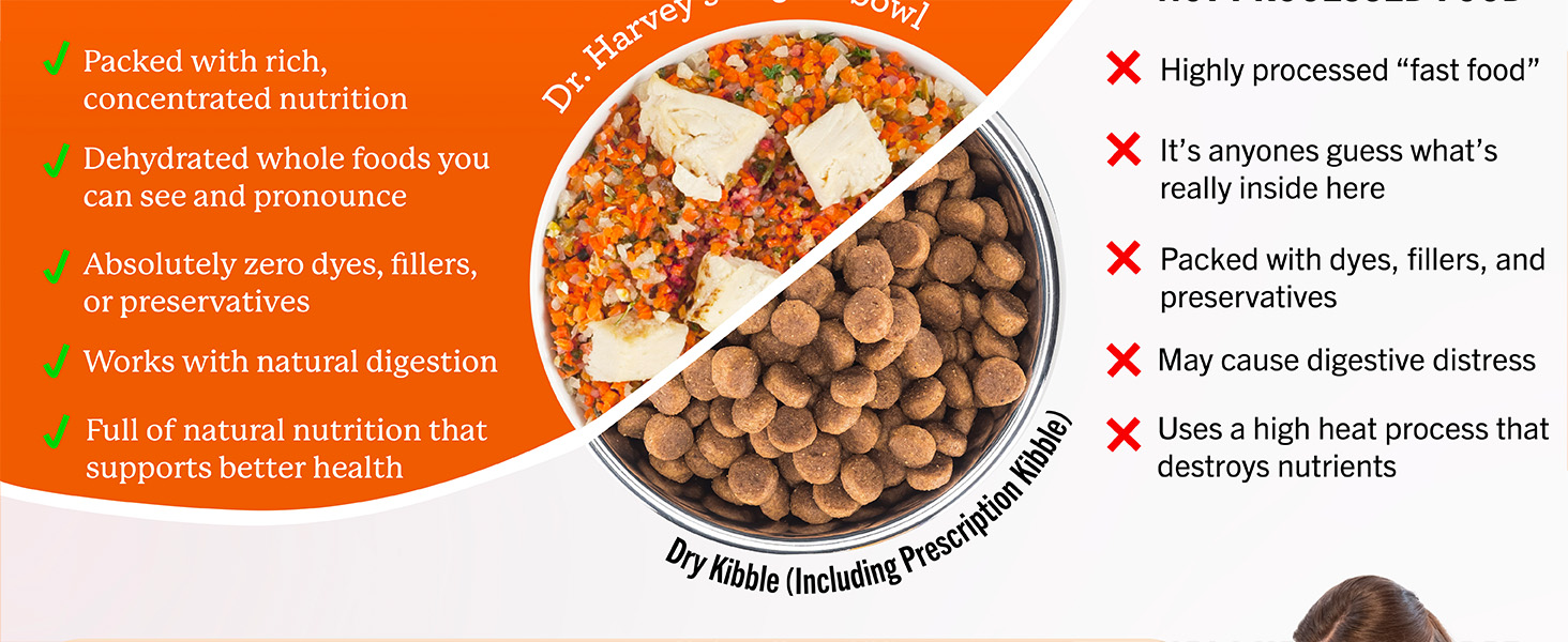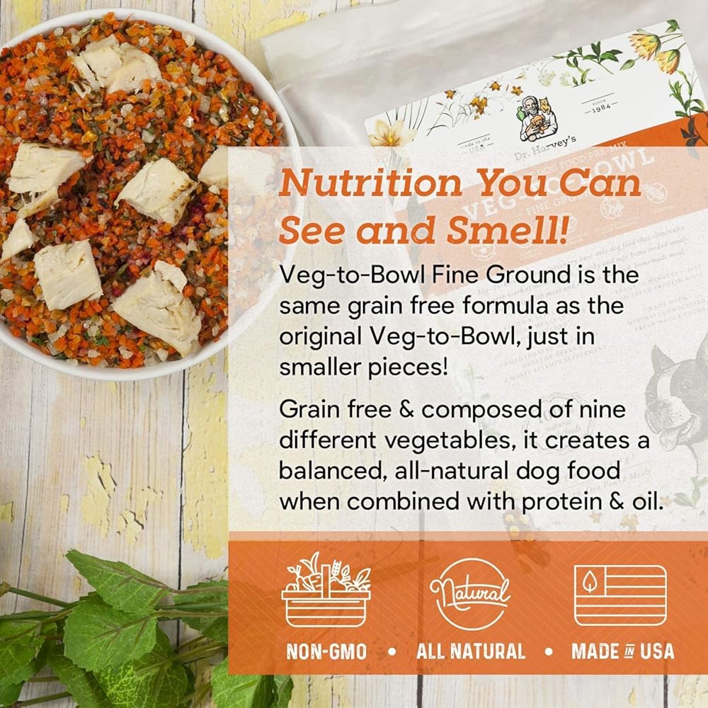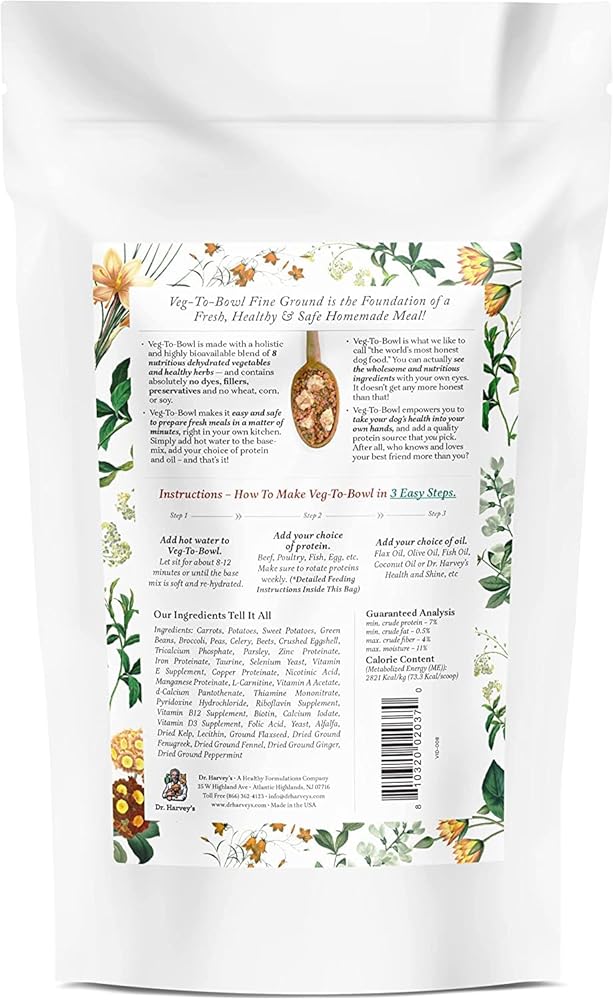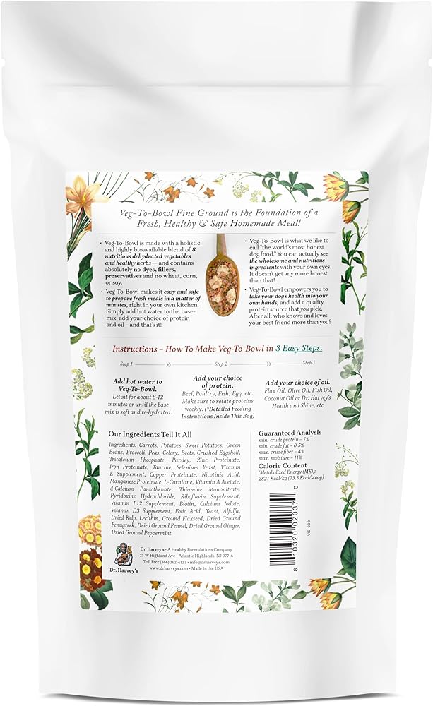كيس بوزن 3 رطل يصنع 28 رطلًا من الوجبات الجاهزة؛ نفس التركيبة الخالية من الحبوب مثل تركيبة الخضار الأصلية من دكتور هارفي، ولكن في قطع أصغر