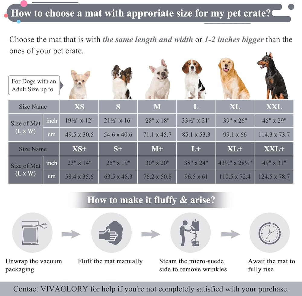 • 【Mat for PET CRATE】Instead of sleeping on the hard, cold and uncomfortable floor of the crate, how about making your pet's crate comfortable and inviting by placing soft, washable bedding inside? Turn your pet's crate, carrier, or kennel into their favorite spot with VIVAGLORY pet crate mat, which is the ideal option when a big and bulky bed just won't fit. NOT intended for a large support bed