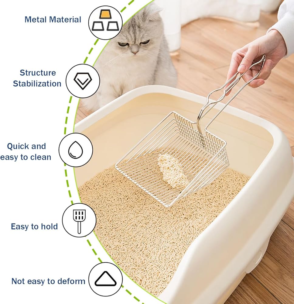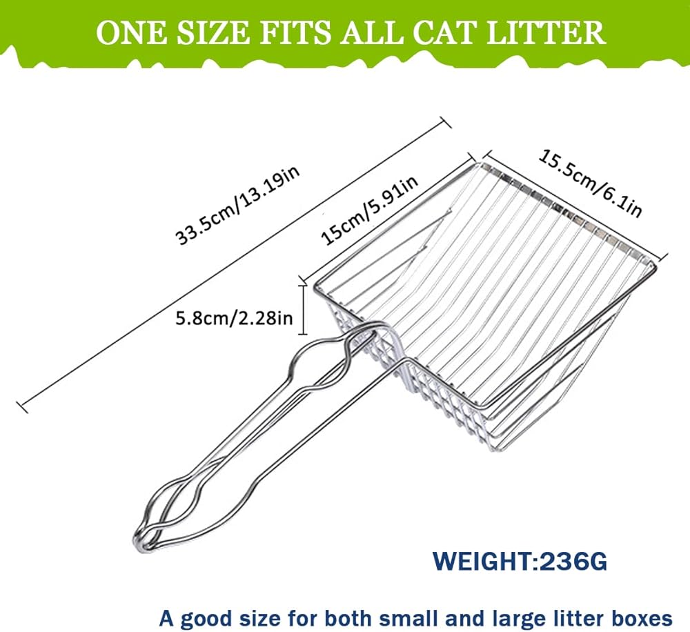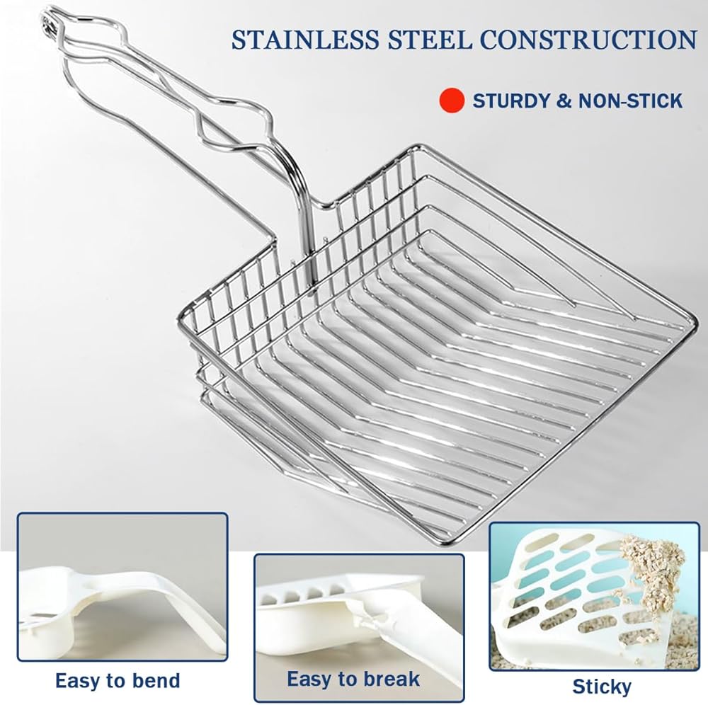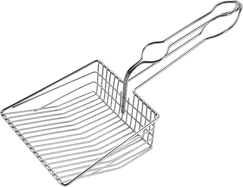 - مغرفة فضلات القطط المصنوعة من الفولاذ المقاوم للصدأ: قوية ومتينة، ومريحة في الإمساك، وتخدش الجزء السفلي من صينية الفضلات.