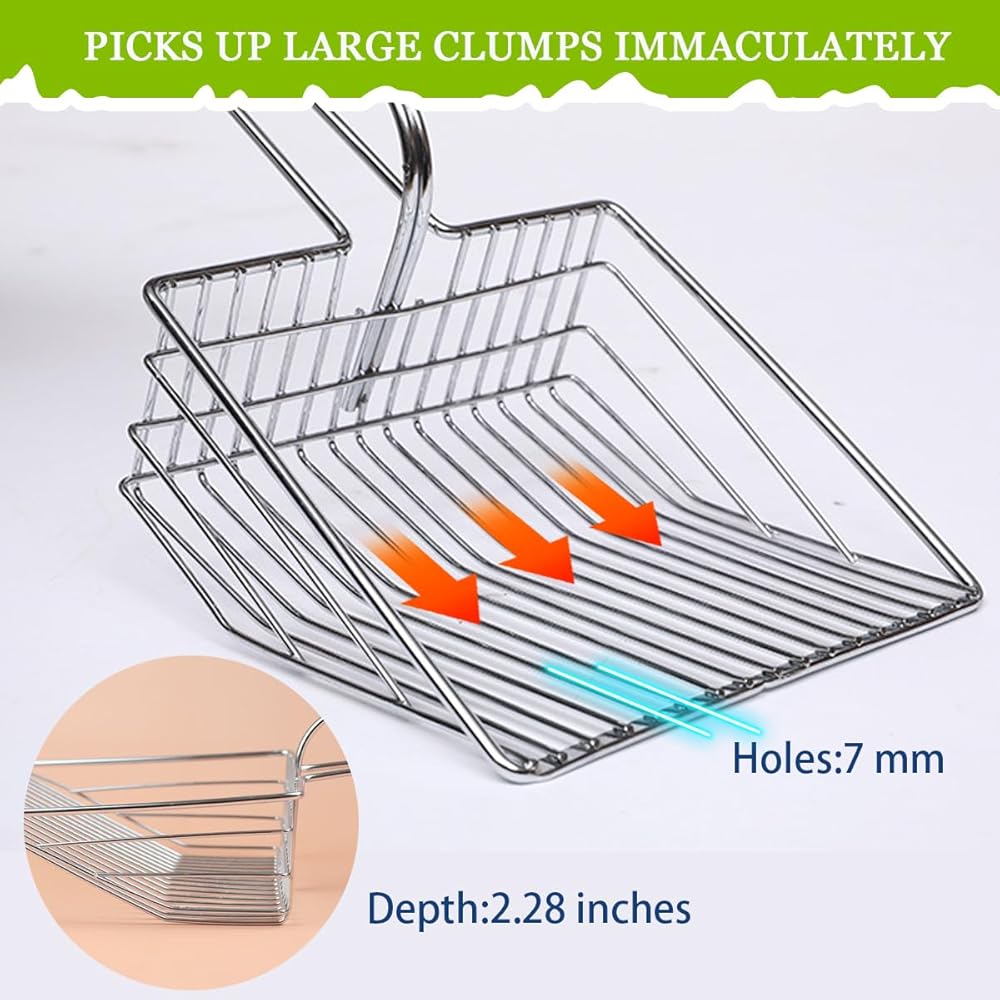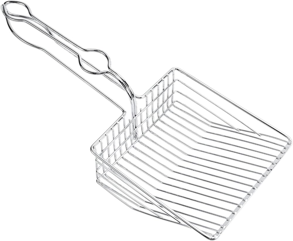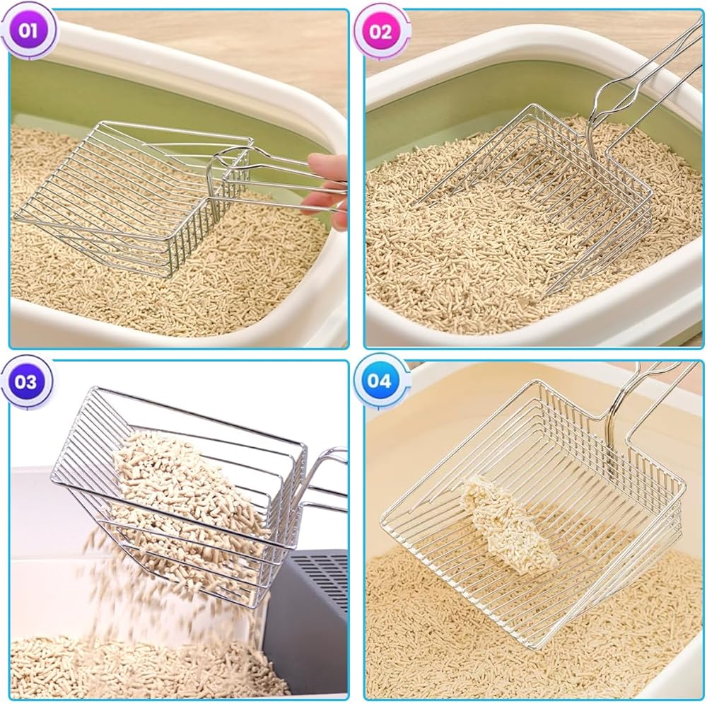 - مغرفة فضلات القطط المصنوعة من الفولاذ المقاوم للصدأ: قوية ومتينة، ومريحة في الإمساك، وتخدش الجزء السفلي من صينية الفضلات.