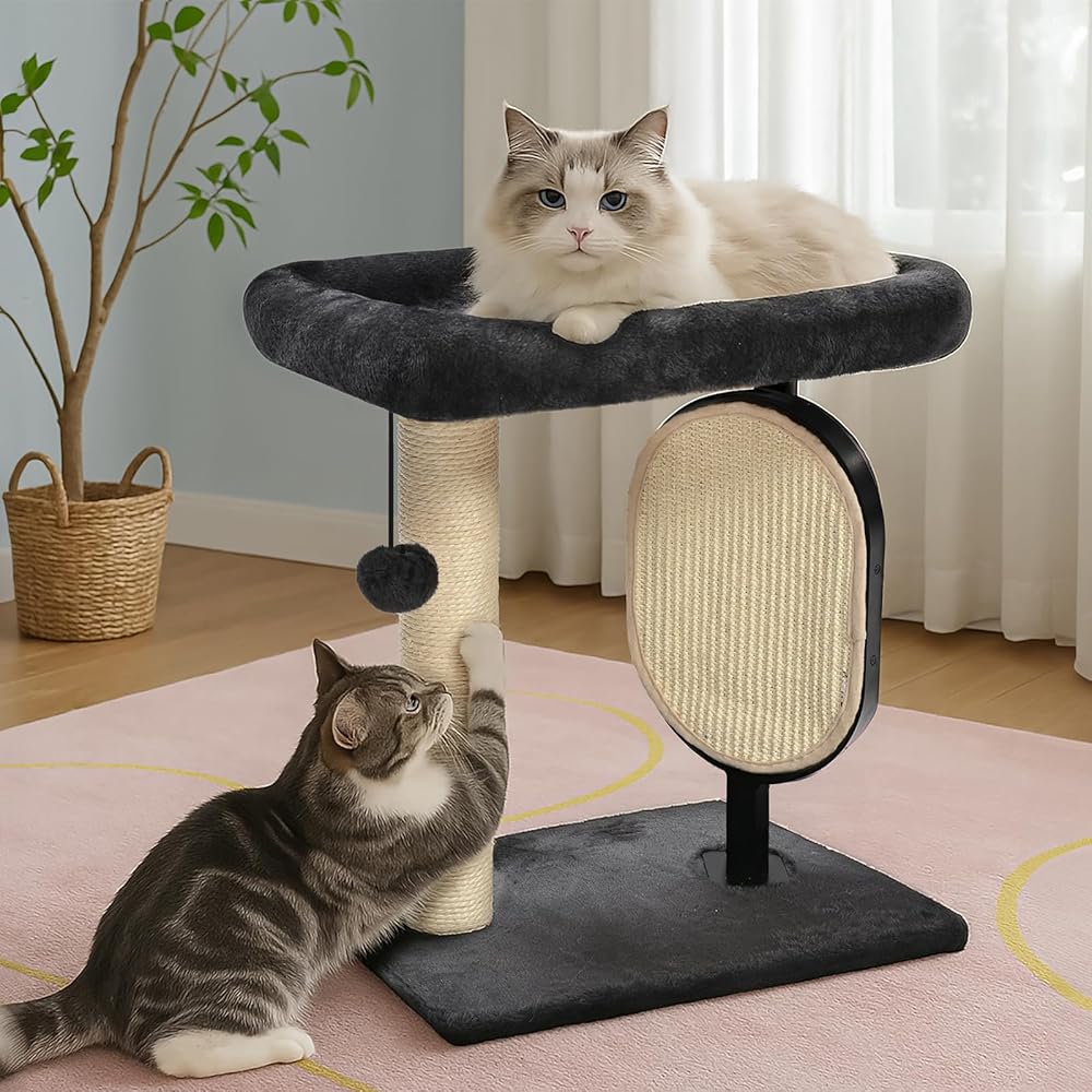 - 2 sturdy scratching posts, plush suspended hammock, secure base, and a replaceable dangling soft ball toy
