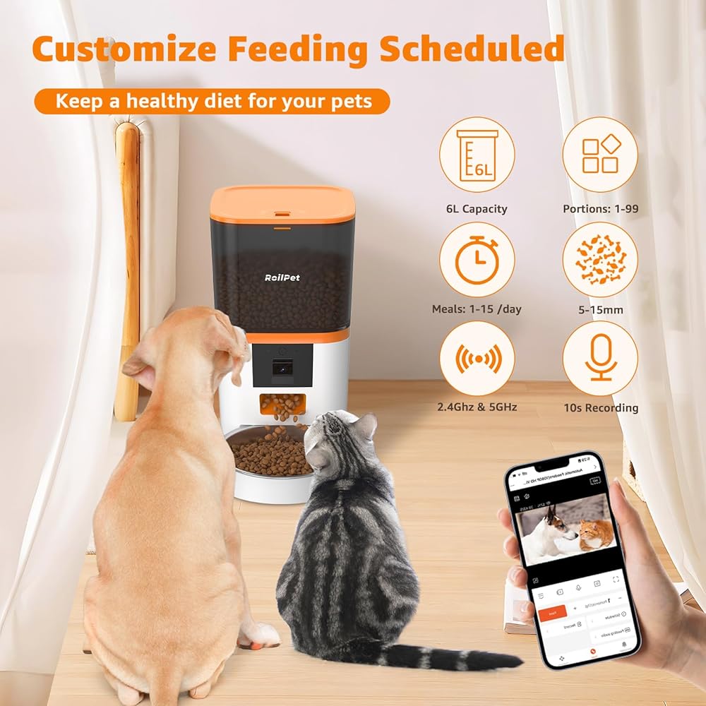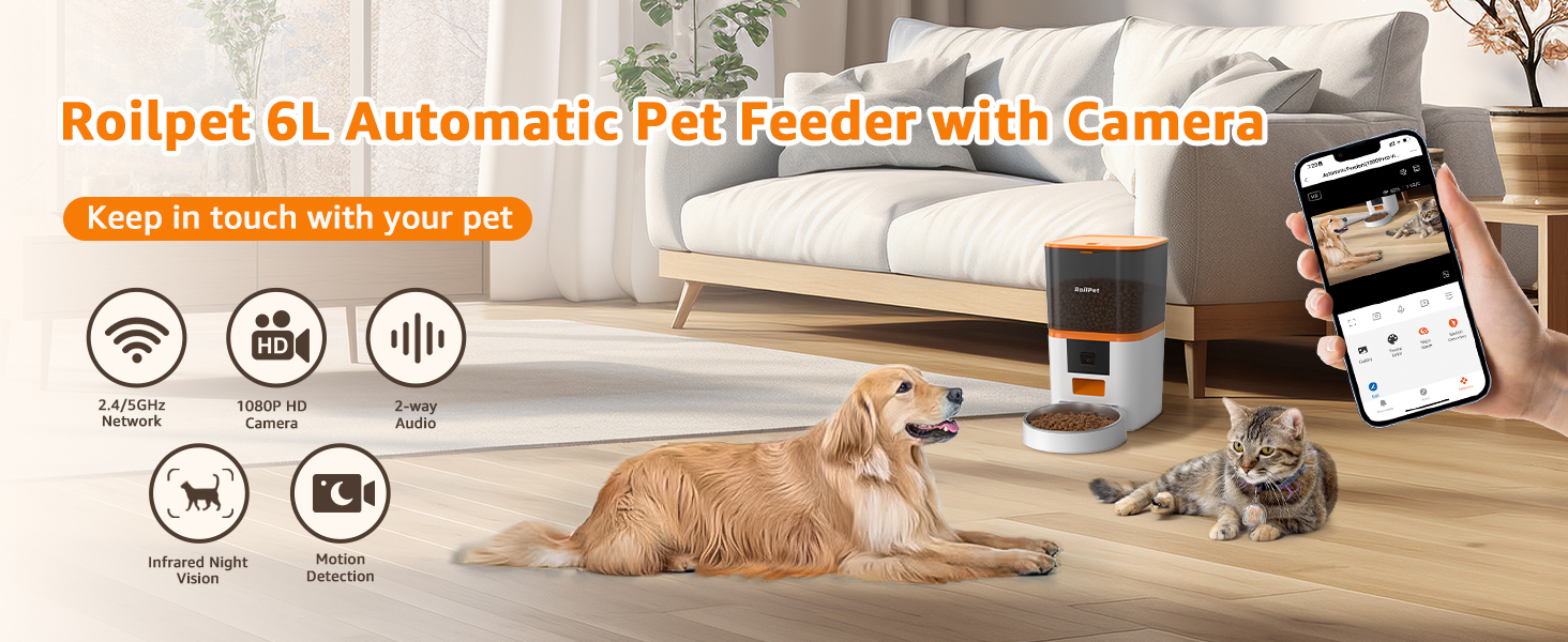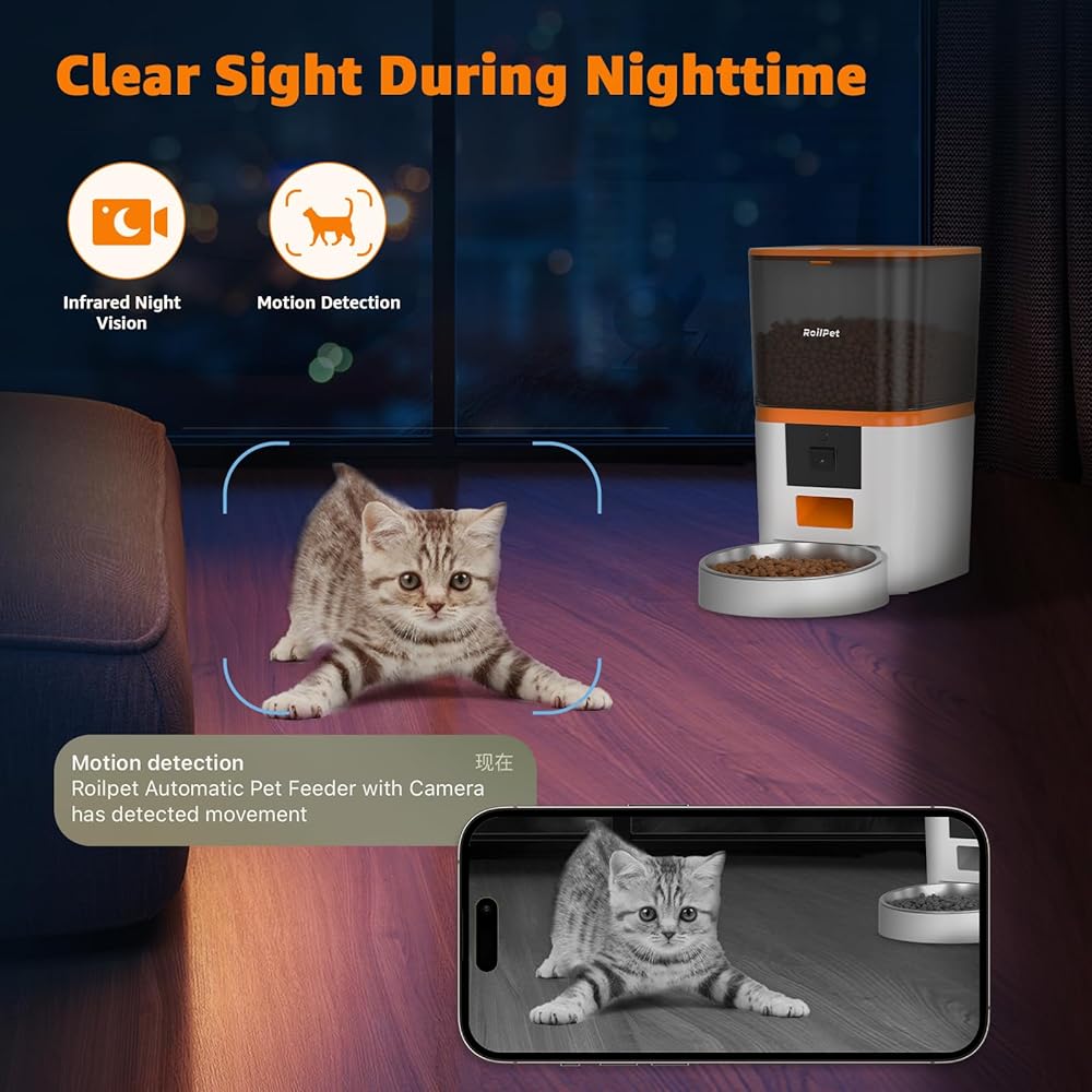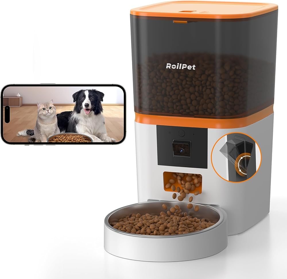 جهاز تغذية الكلاب الأوتوماتيكي من Roilpet مع كاميرا، موزع طعام القطط الذكي 5G WiFi 6L، فيديو عالي الدقة 1080P مع رؤية ليلية، جهاز تغذية الحيوانات الأليفة مع صوت ثنائي الاتجاه للقطط والكلاب، تنبيهات انخفاض الطعام والانسداد والحركة