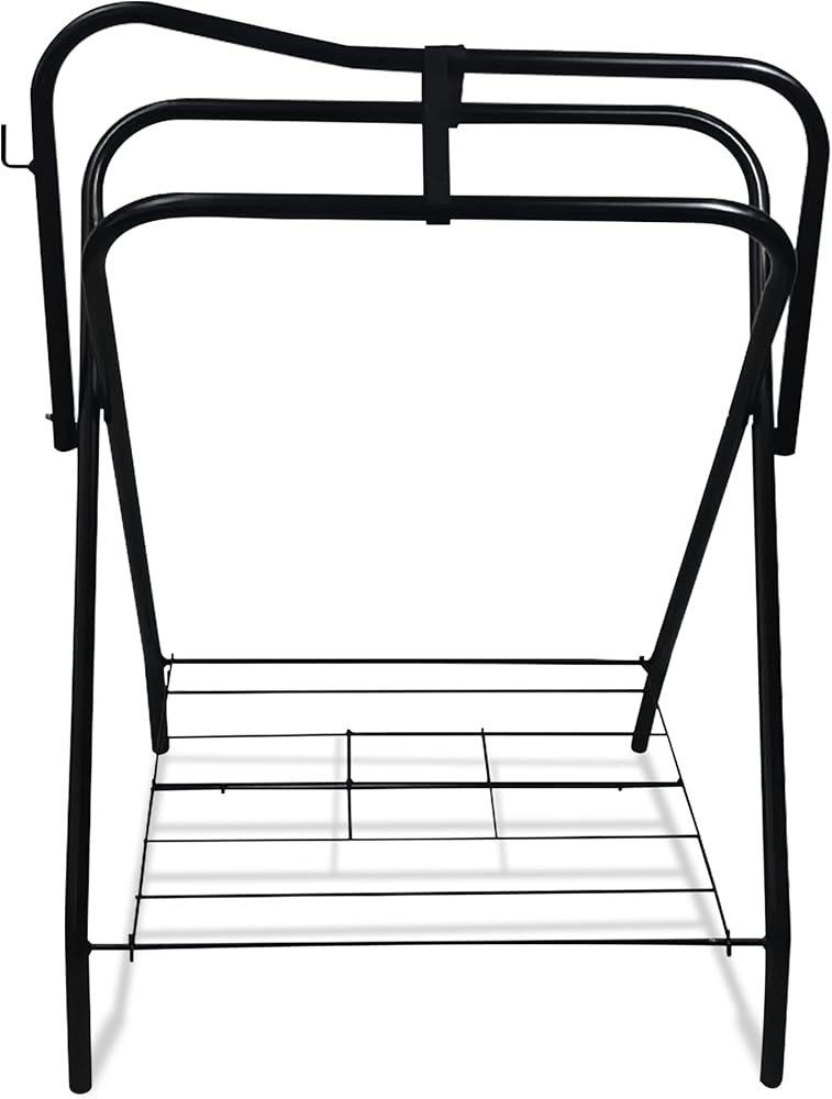 SADDLE STORAGE Not just a horse saddle holder, this free standing saddle rack stand also features a bottom wire grid shelf for storing other accessories.