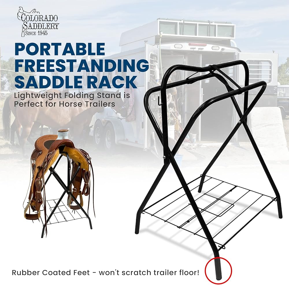 PERFECT FOR TRANSPORT Lightweight and foldable, with protective rubber coating on its feet to prevent scratching floors, this portable saddle rack collapses in seconds, making it a perfect travel saddle rack for your trailer.