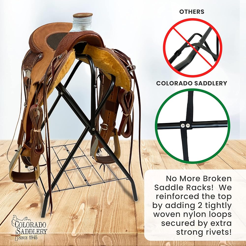 VERSATILE HORSE SADDLE STAND This western saddle stand is an ideal choice for horse riders who need an versatile saddle stand that can securely hold their saddle -both at home or in the trailer while on the road!