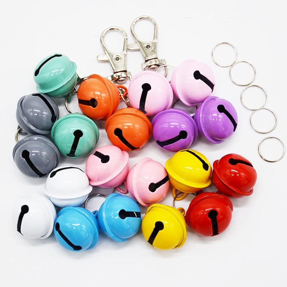 • العبوة: تتضمن 20 جرسًا كبيرًا من الألوان المتعددة: البرتقالي والأخضر والأزرق والوردي الفاتح والأبيض والأرجواني والرمادي والأصفر والأحمر. تتضمن أيضاً 10 حلقات مفاتيح و3 مشابك.
