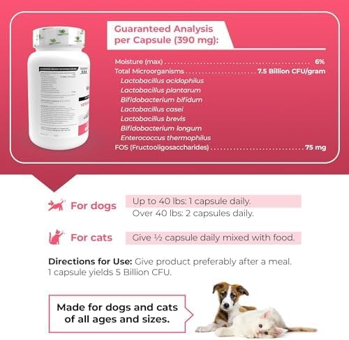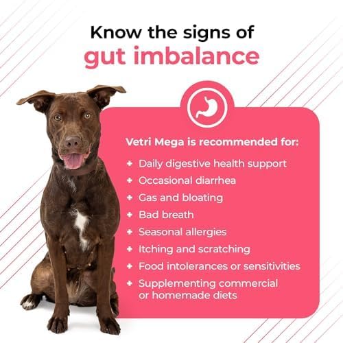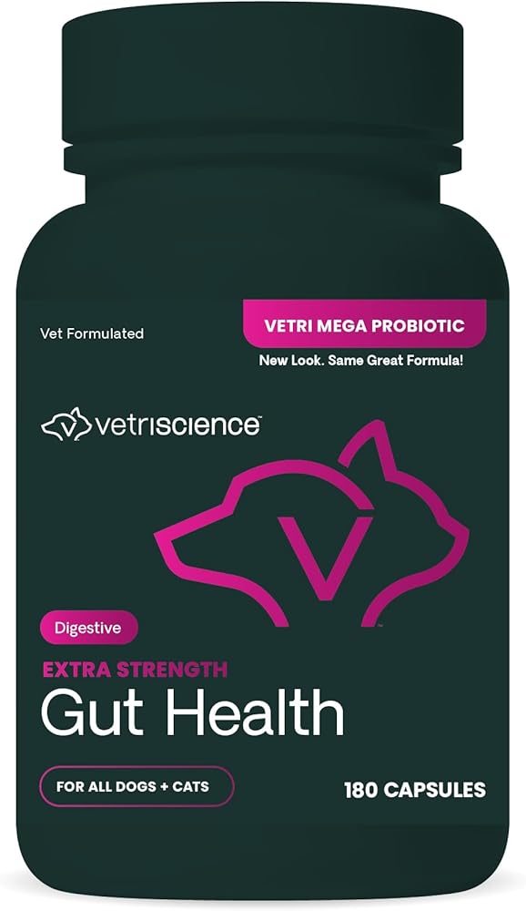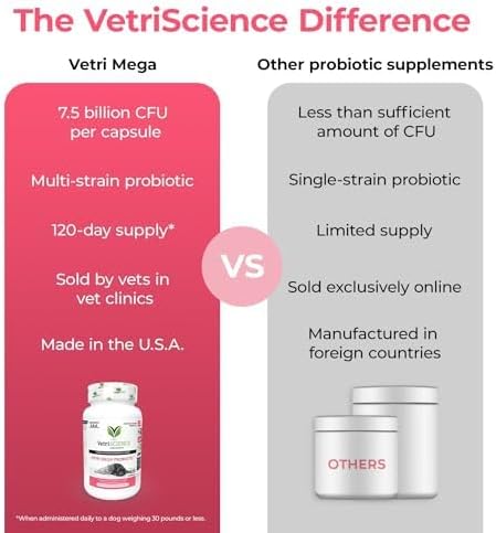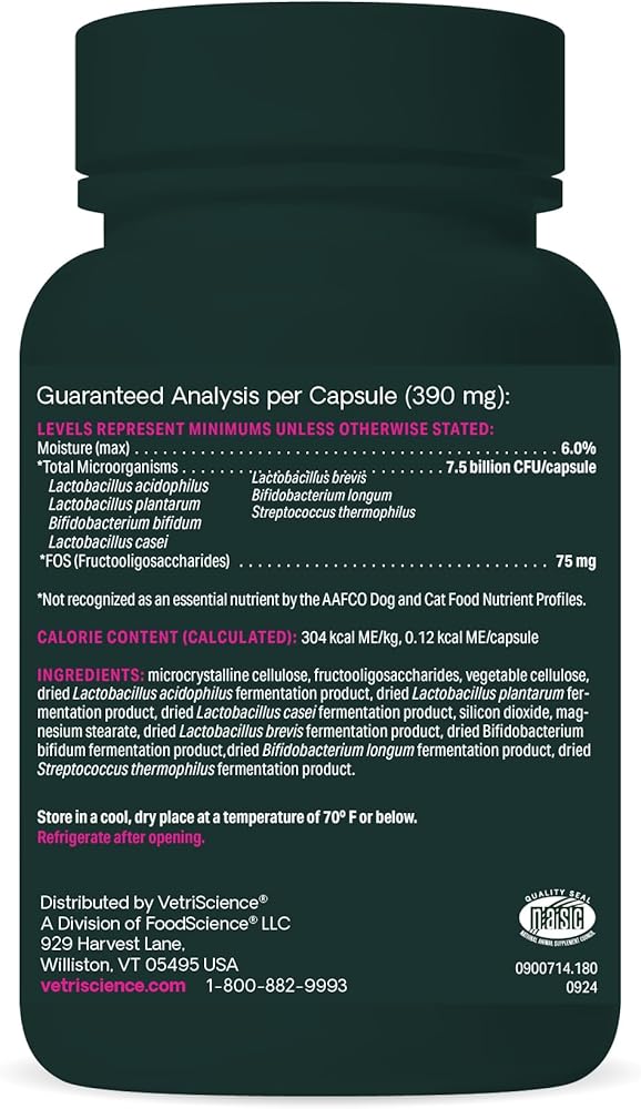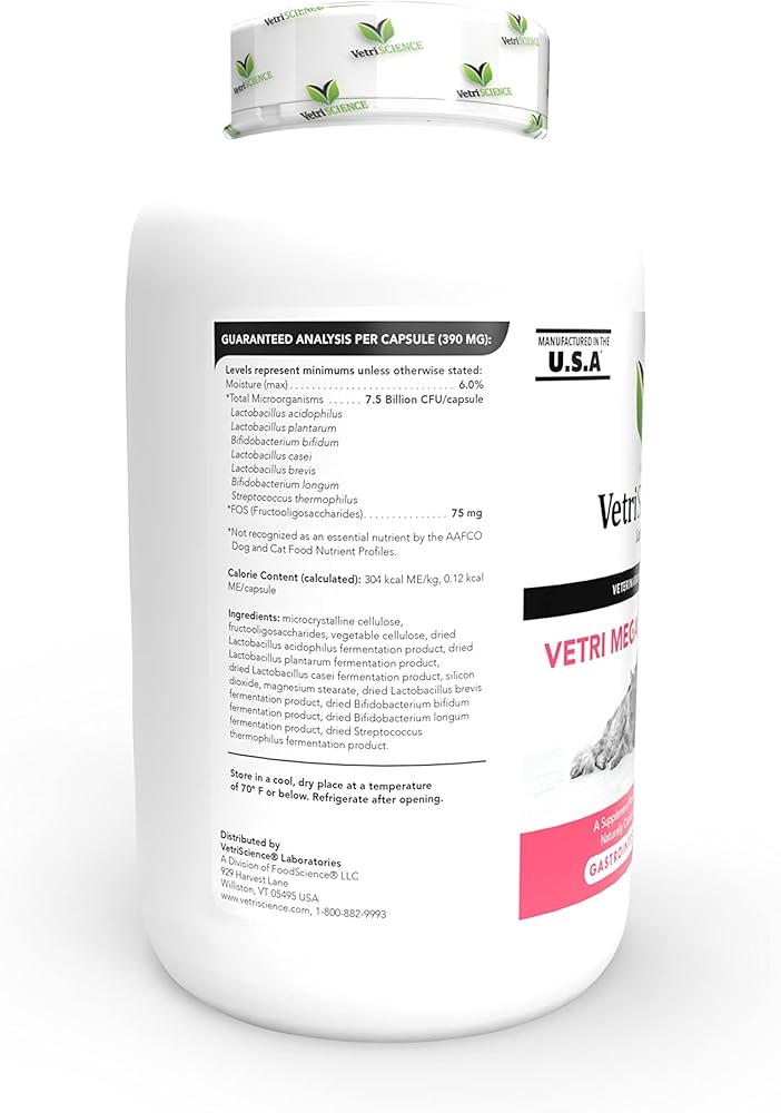 VetriScience Laboratories- Vetri Mega Probiotic, Digestive Support with Probiotics and Prebiotics for Dogs and Cats, 120 Capsules Product description (optional) : Vetri Mega Probiotic capsules provide an easy way to support your pets with digestive health issues. Our probiotic guarantees 5 billion beneficial microorganisms to the gut to assist with digestive regularity. This formula also includes Fructooligosaccharides (FOS), a soluble fiber and prebiotic which can support the growth of beneficial microorganisms that help normalize digestion and support regularity. The capsule delivery system allows for a cleaner alternative for pets that deal with allergies. The capsule can be given directly, sprinkled or hidden in another treat. Vetri Mega Probiotic also provides immune support, aids in issues related to food intolerance and, helps counteract the sometimes irritating effects of antibiotics in the digestive tract.