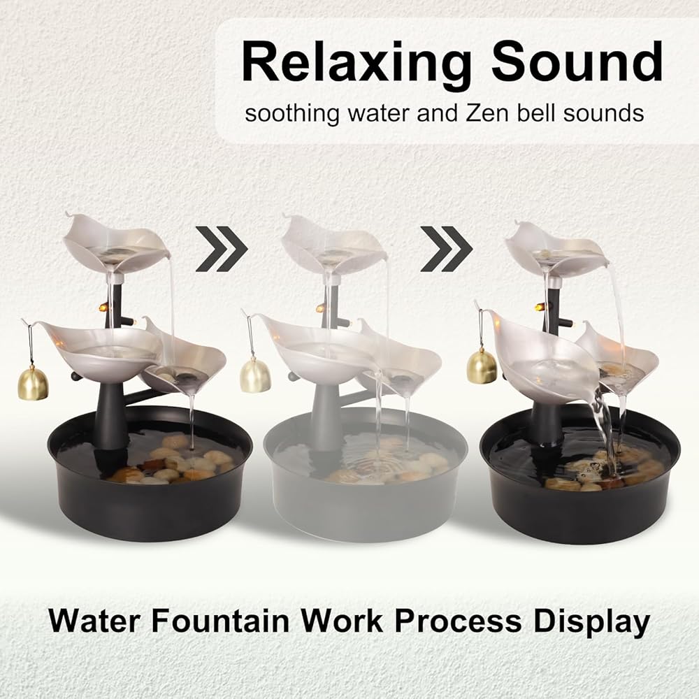 ORIGINAL DESIGN - Our modern tabletop water fountains are designed with plant leaves water channels and bells. Immerse yourself in a sensory journey, you will not only experience the relaxation sound of flowing water but also the mindfulness sound of bells.