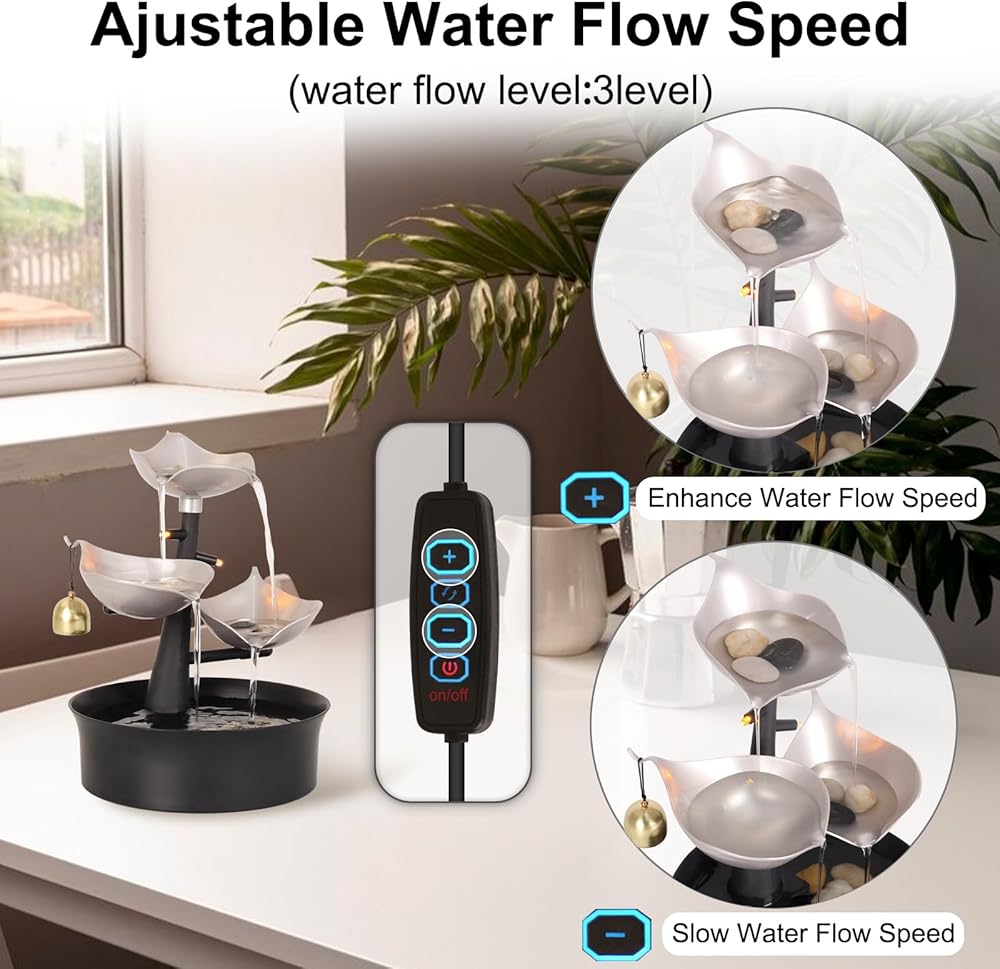 ADJUSTABLE WATER FLOW - Customize the fast or slow water flow, according to your preferences using control knob. If the sound of the water flow is not gentle enough or if the water splashes around, you will need to adjust the number of stones on the leaves. NOTE: Our tabletop waterfall equips a silent water pump for peaceful water sounds.