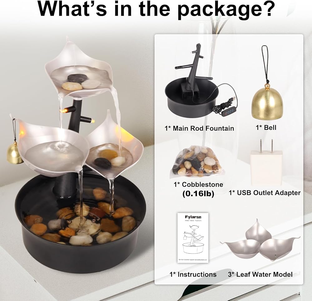 NICE WARRANTY - Package Contents include 1* Main Rod Fountain, 3* Leaf Water Model, 1* USB Interface (USB Outlet Plug Included), 1* Natura Cobblestone (0.16lb), 1* Bell, 1* Instruction. If you receive the desk fountain with missing parts or any quality issues, please do not hesitate to contact us. 24/7 online customer service is available for you.