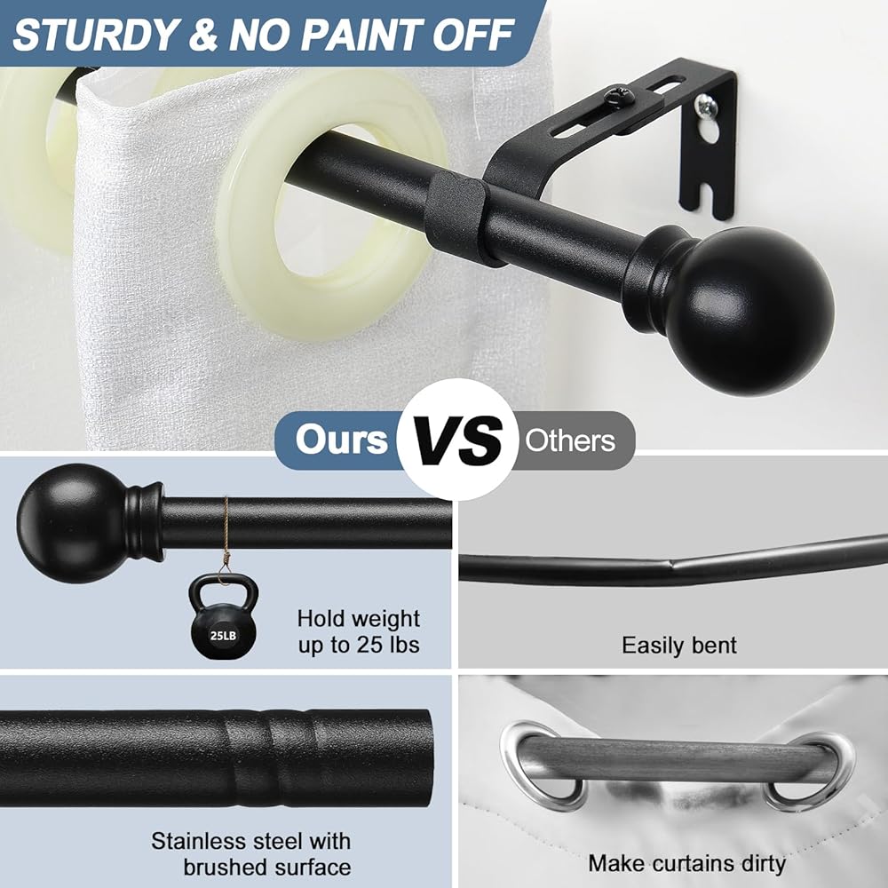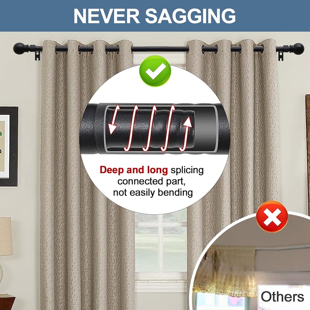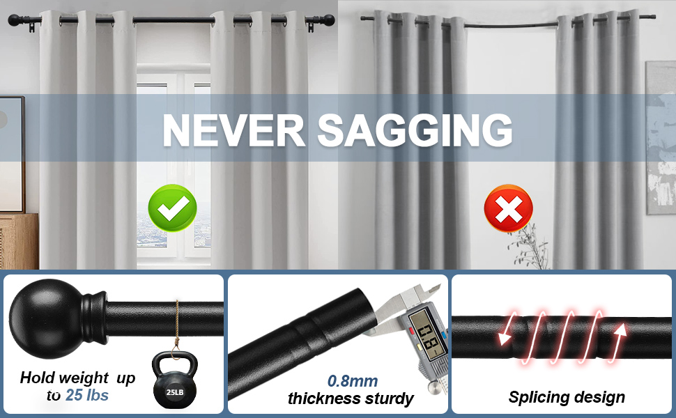 لا يتدلى أبدًا في المنتصف: قضيب ستارة النوافذ الخاص بنا مصنوع من معدن الفولاذ المقاوم للصدأ عالي الجودة بسمك 0.8 مم، وقادر على التعليق حتى 25 رطل. يعمل جزء التوصيل العميق والطويل على تعزيز سعة الحمولة، والتي لا يمكن ثنيها بسهولة في المنتصف.