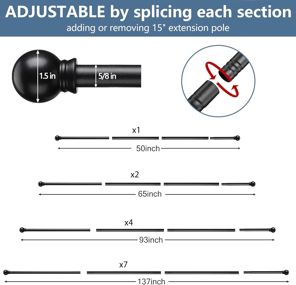 طول قابل للتعديل: تتميز قضبان الستارة السوداء الخاصة بنا بسهولة التركيب. ما عليك سوى إضافة أو إزالة قضبان تمديد مقاس 15 بوصة لتحقيق ملاءمة مثالية مع نوافذك. يرجى قياس حجم نافذتك قبل الشراء واختيار حجم قضيب الستارة الذي يناسب نافذتك. تتضمن الحزمة أيضًا قضيبًا قصيرًا بديلاً لتعديل الحجم المرن إذا لم يكن المقاس مناسبًا، فإن الاستبدال أو استرداد الأموال متاح بدون إرجاع بمجرد مراسلتنا.