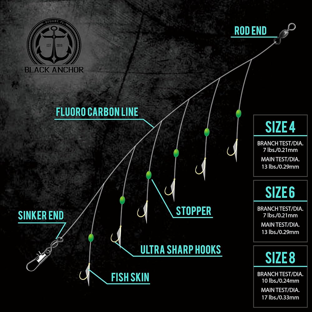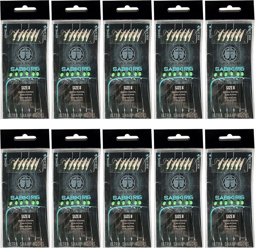 Elevate your bait-catching game with the Black Anchor 10-Pack Sabiki Kit! Designed to enhance your fishing experience, each kit includes 10 individual packs of expertly crafted sabiki rigs. Choose from three size options – #4, #6, and #8 – to target a variety of bait species. These rigs feature chemically sharpened hooks for increased catch rates and corrosion resistance. Pre-rigged for convenience, each pack comes with a swivel at the rod end and a snap-swivel on the weight end, allowing for quick adjustments. With high-visibility green beads and an HQ fish skin attractant, these rigs are designed to lure even the pickiest bait fish. Whether you're aiming for Sardines, Threadfin, Silver Perch, or other species, the Black Anchor Sabiki Kit is your go-to solution for successful bait fishing.